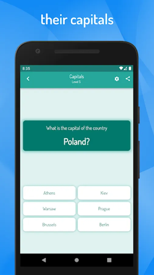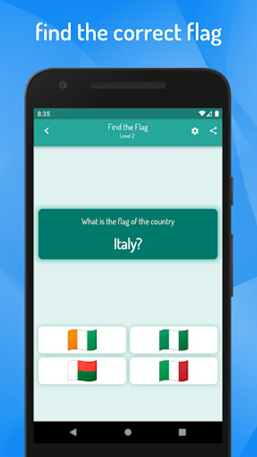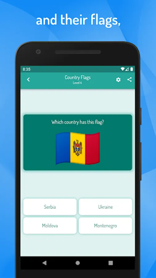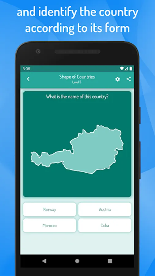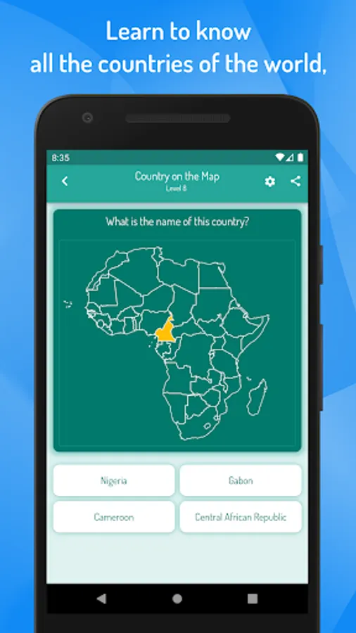 In this geographic game, you will learn to know the names, flags, cities and capitals of all the world countries as well as know how to identify them on the map of the world.
