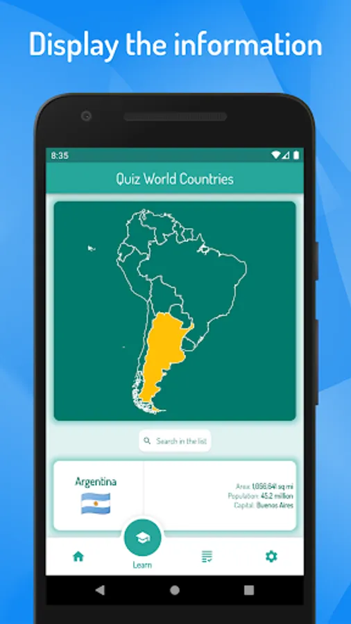 To get to know the world countries, simply select the learning mode and click on the map of the world to view the details of the selected country, including the country capital, its flag, area of the country and its population.