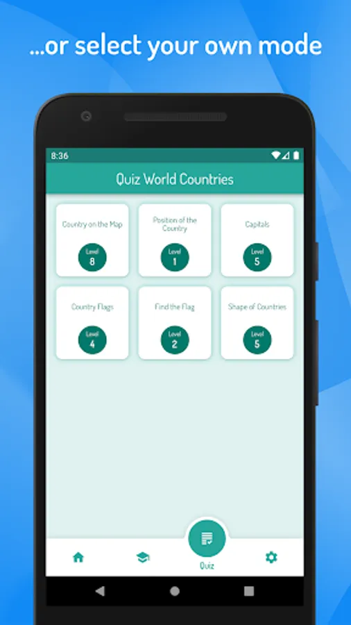 In each quiz mode, you can select between two, four or six choices offered. If your answers are correct, you advance to a higher level with increasingly difficult questions.