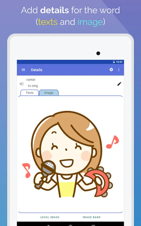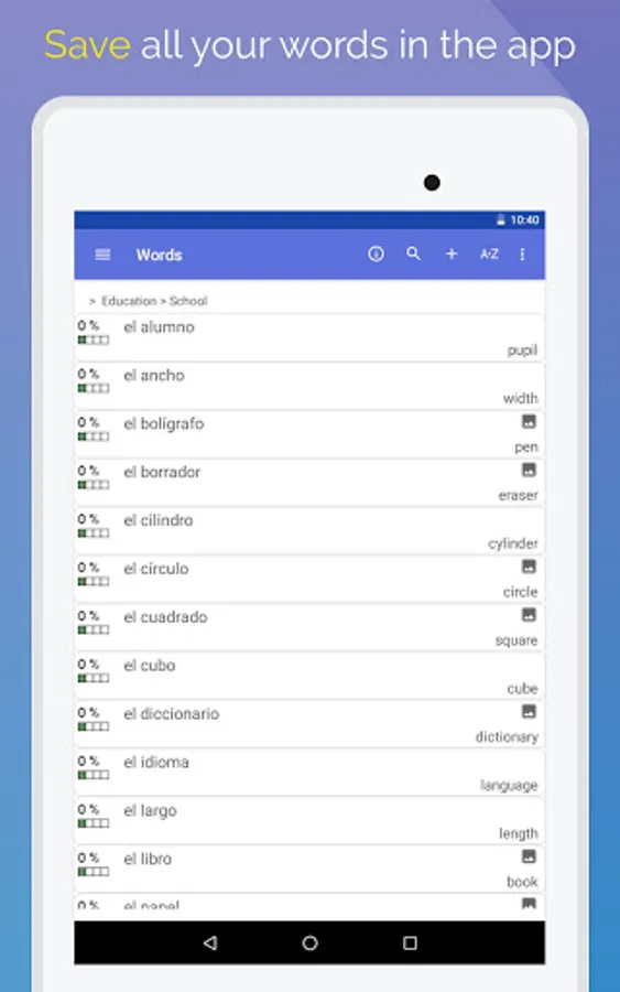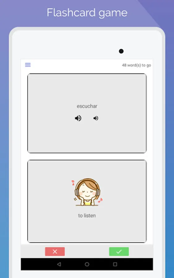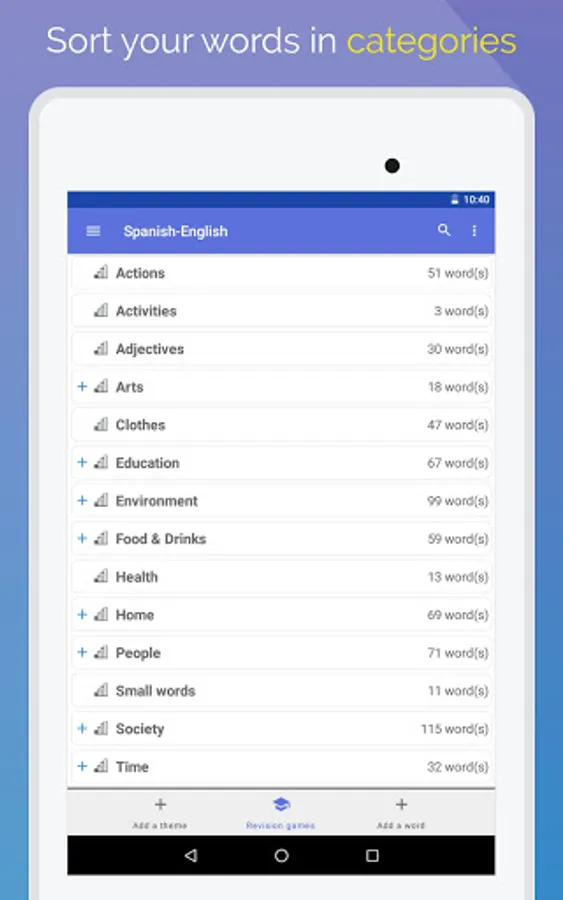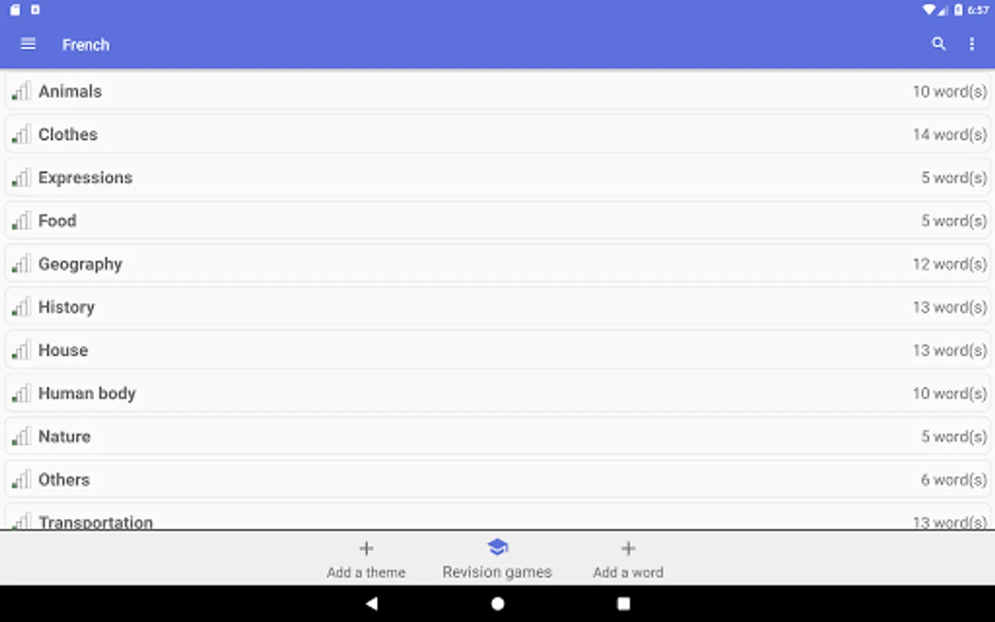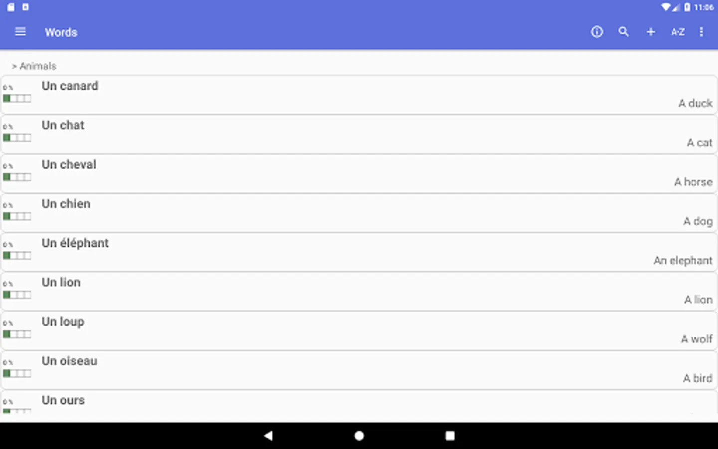 This app can also help as a vocabulary trainer. To help you learn and memorize the words of your dictionary, "My personal dictionary" contains several games: