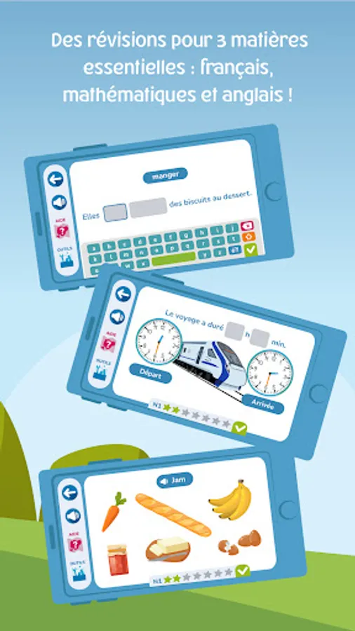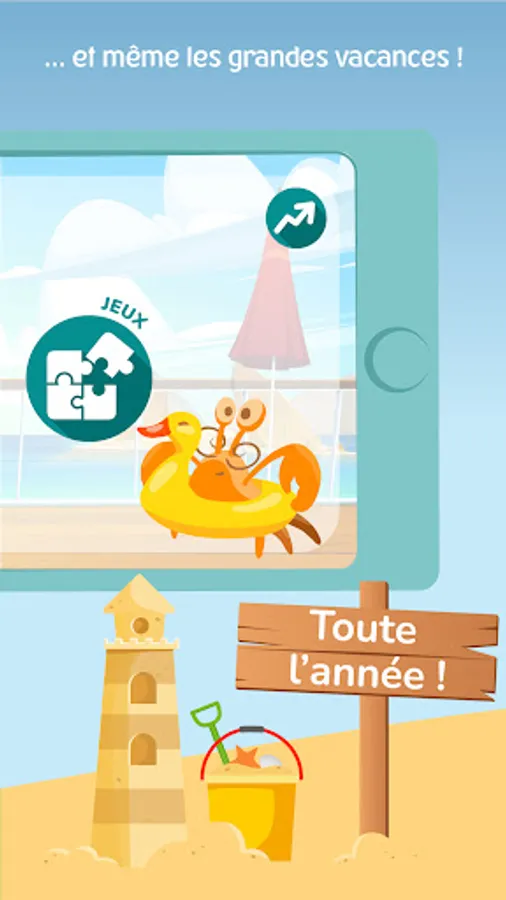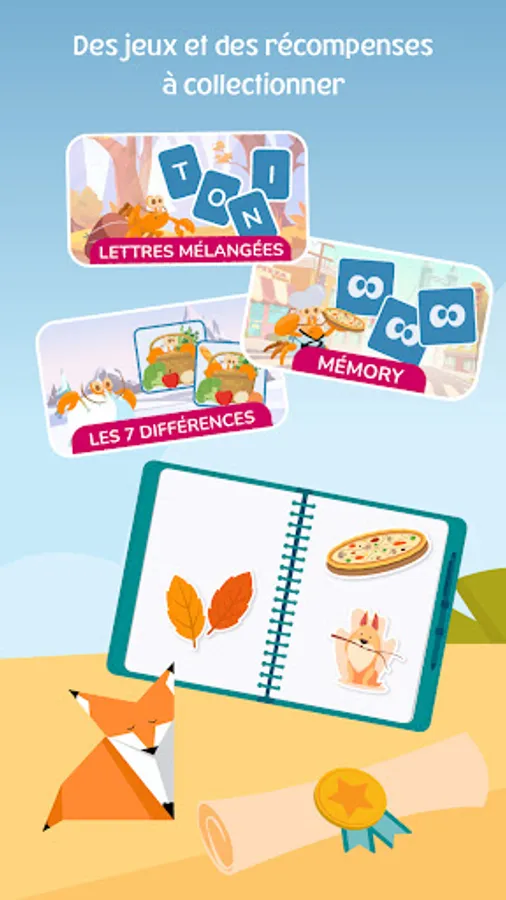 During the course, moments of relaxation are offered through extension activities, games and end-of-session rewards. The child wins virtual souvenir stickers, to stick in the application in the dedicated place on his travel diary, but also on his suitcase during the summer holidays.