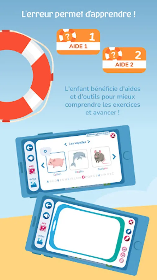 If the child makes a mistake, our mascots are there to help him and help him progress. One mistake: one help, two mistakes: a new help, three mistakes: it doesn't matter, he can redo the exercise later.