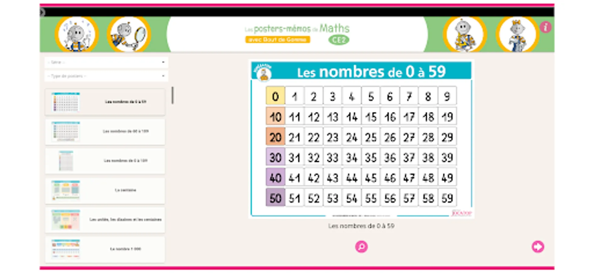 The essentials of the CE2 mathematics program are covered through 40 paper posters, animated by the characters of Bout de Gomme, Tirobot and Robotine. Two types of posters are available: