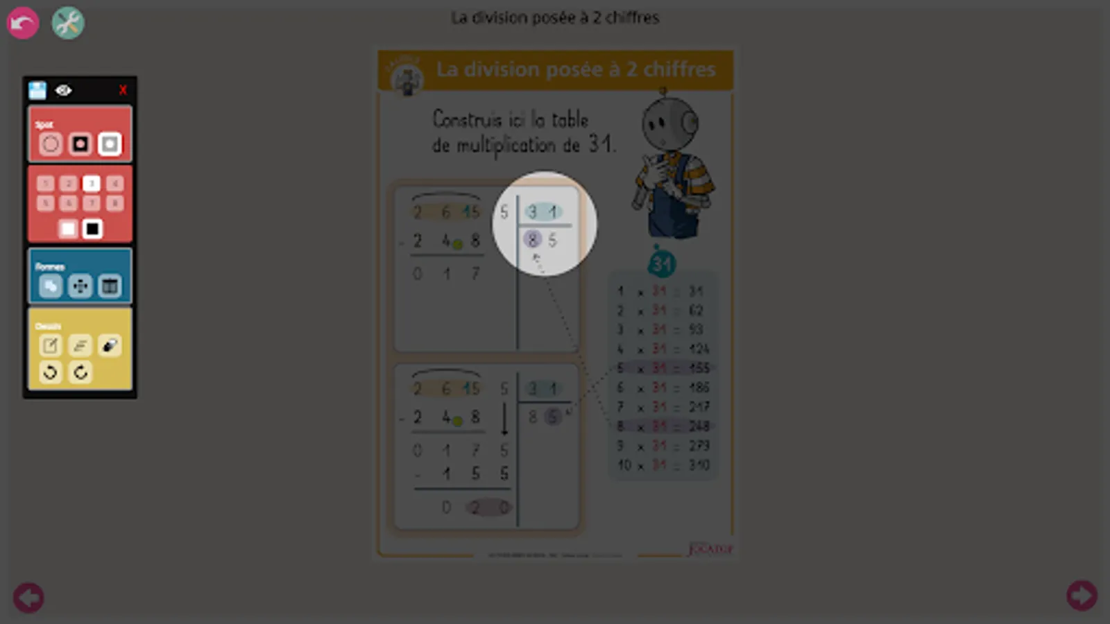 The Maths CM2 posters-memos application allows posters to be screened and filtered by discipline and type of document. The graphic toolbox offers varied and comprehensive devices for highlighting, hiding or annotating document elements.