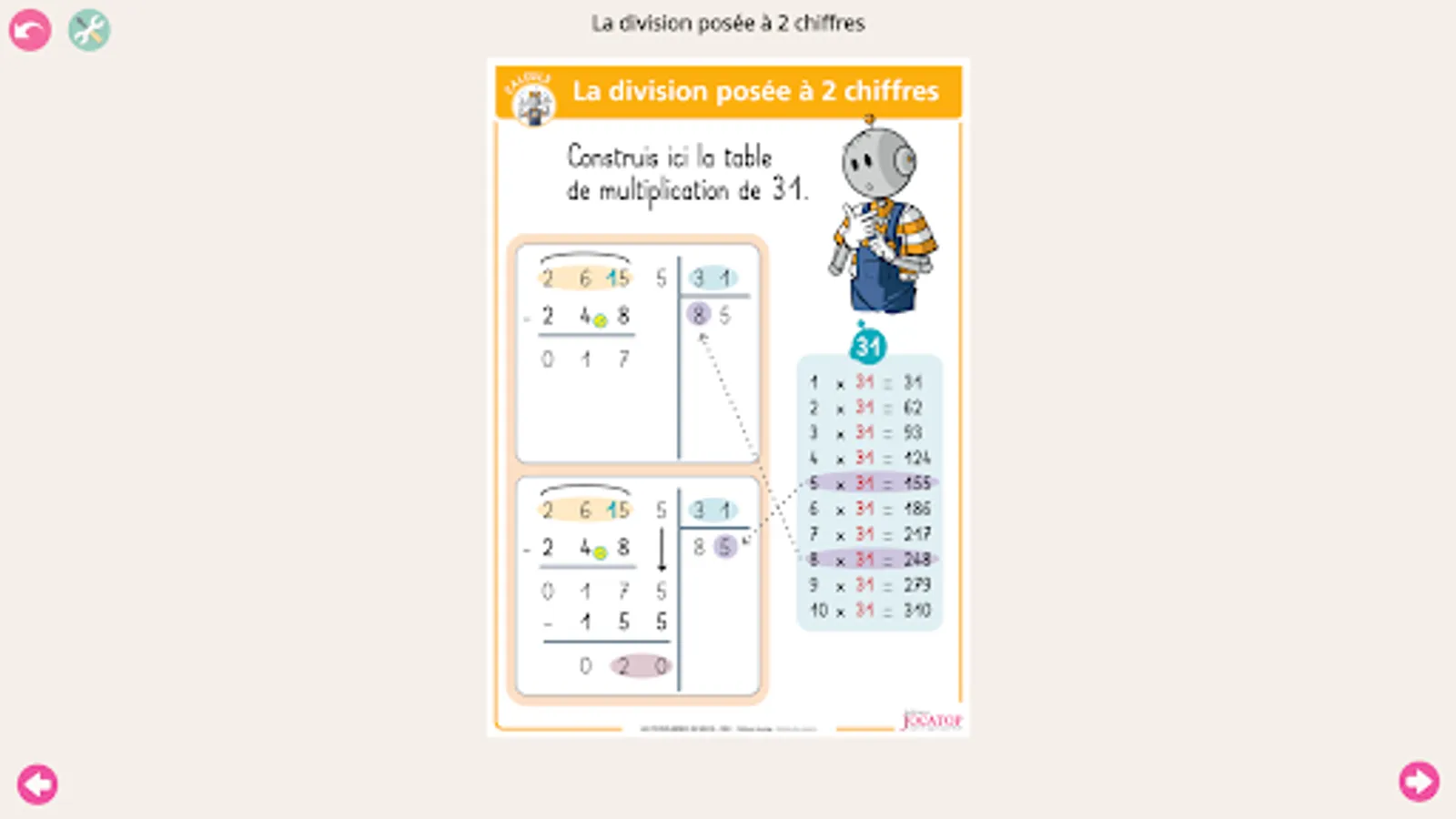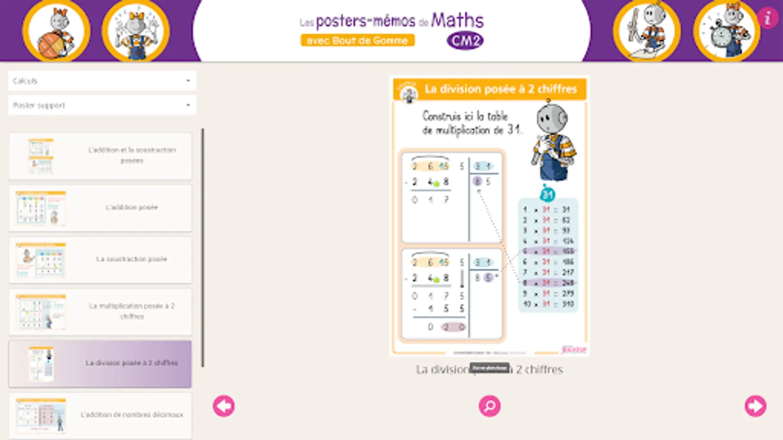 The essentials of the CM2 mathematics program are covered through 40 paper posters, animated by the characters of Bout de Gomme, Tirobot and Robotine. Three types of posters are available: