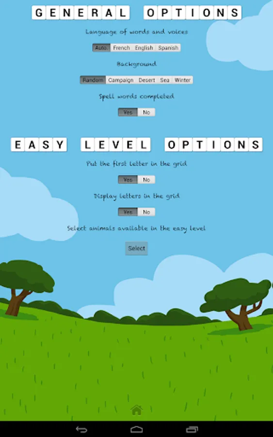 - Three levels of difficulty with an easy level fully customizable (font size, animals ...)