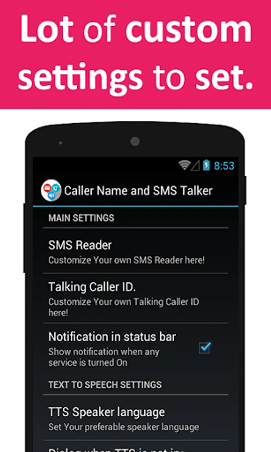 ★ Lot of different settings to pick, like auto-read message, delay before speaking, etc.