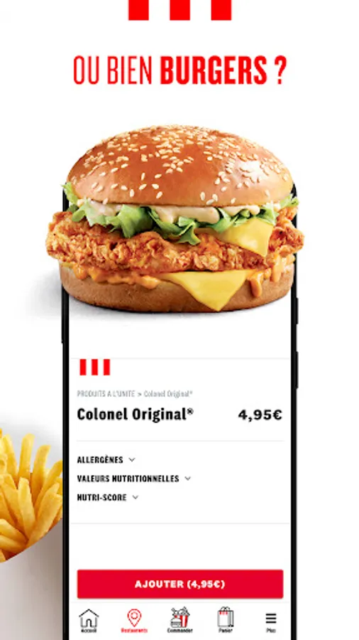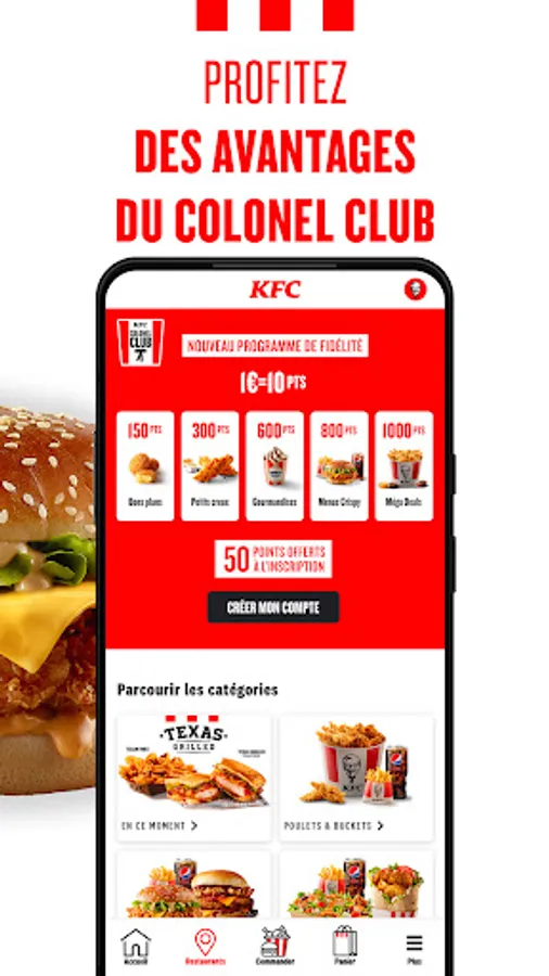 On the application you will find our Crousti' fromage®, all our Chicken Buckets, without forgetting our burgers like Kentucky with our melted aged cheddar, bacon on the burger bun, all sprinkled with crispy onions... It gives the mouth watering.