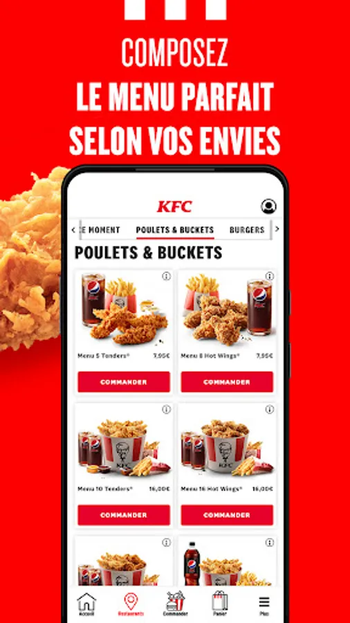 All our fried chicken burger recipes, our menus for adults and children, our current novelties are present on the KFC® menu in the application. Do not hesitate to order to withdraw your order in Click & Collect.