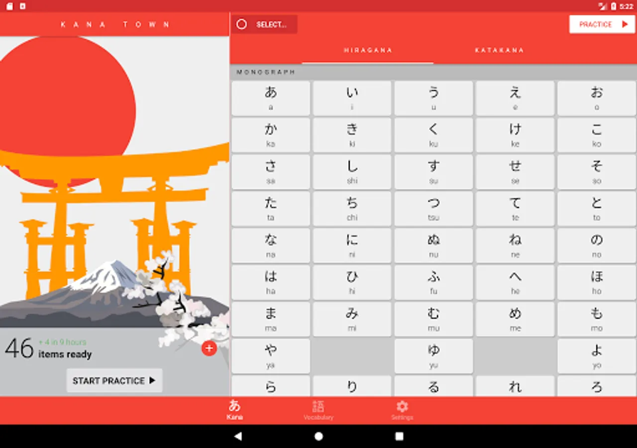 Kana Town is an application to learn the Japanese Hiragana, Katakana and Vocabulary the easy and fun way!