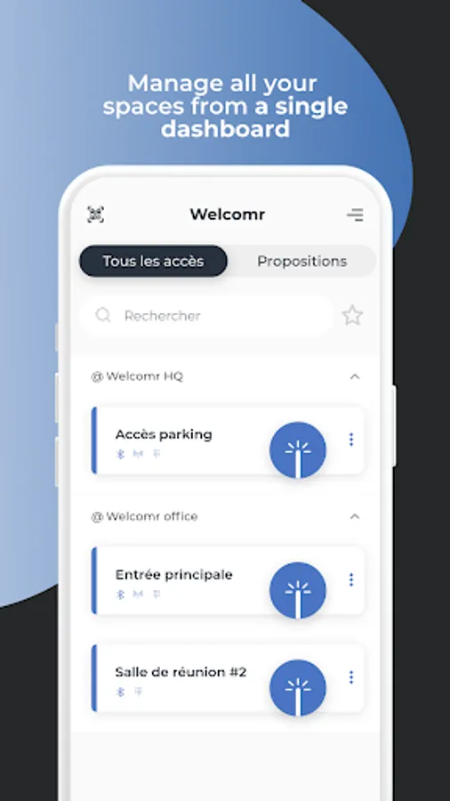 Welcomr is the universal mobile application that gathers your physical access rights in one place: Bookings, meetings or rentals are now right in your hand.