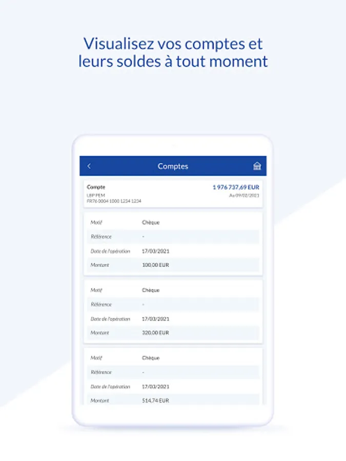 - Consulting all of your accounts and your latest transactions on all your banks managed in your PEM® solution
