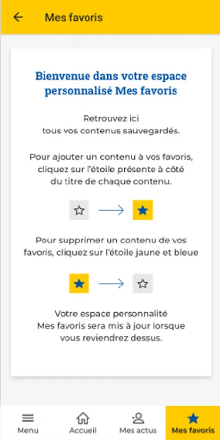 - Want to read an article or watch videos, but time is running out? Select them as favorites with a tap on the little star and find them in the My favorites space to read or watch them whenever you want.