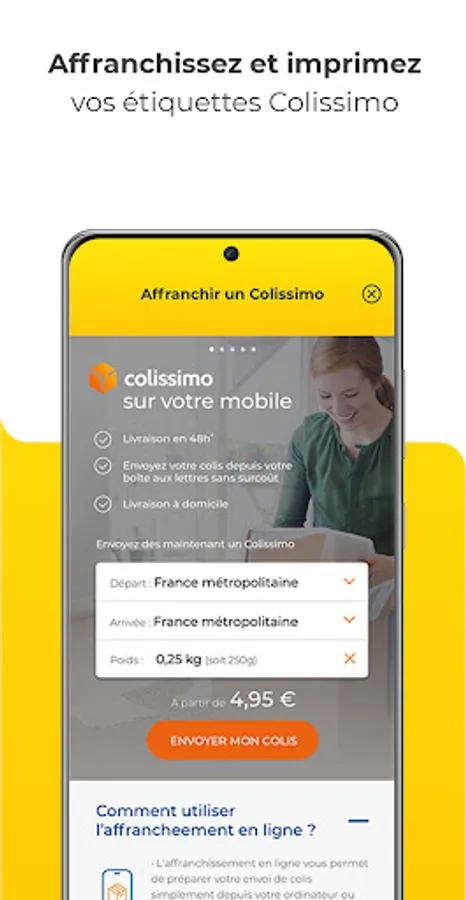 Prepare and print a Colissimo label, track your parcels, change the date or address of delivery of your parcel before midnight, find answers to your questions about tracking your parcels: nothing could be simpler from the application! Thanks to Colissimo online, the postage of your parcels is possible without having to travel, from your home or your office.