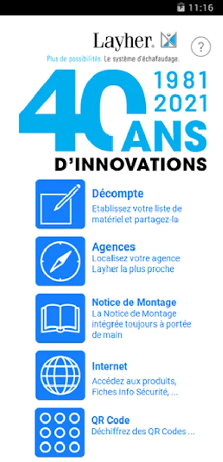 Layher Échafaudages presents its official application for real site use: you can directly access the following modules:
