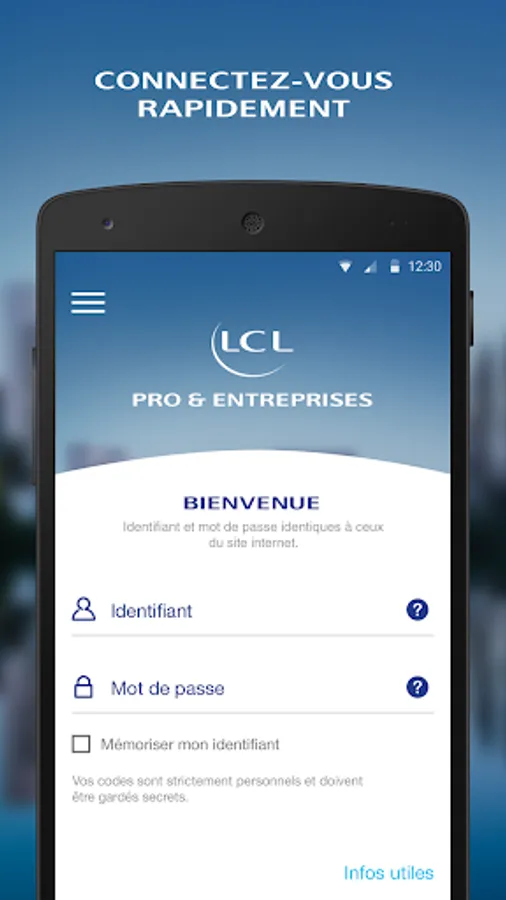 Download your bank's application for free, and log in using your usual LCL Espace Pro or LCL Entreprises credentials, to access your features: