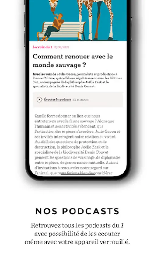 – Podcasts and videos: find your favorite podcasts (“La Voix du 1”, “Les Nouvelles”…) and videos from 1;