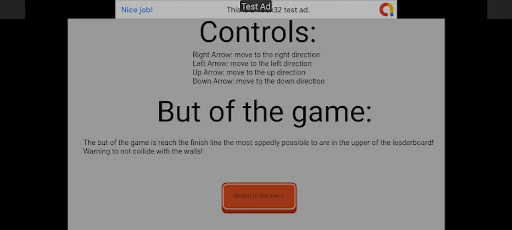 In this game, reach the finish line the most speedly possible! Warning to not collide the walls!
