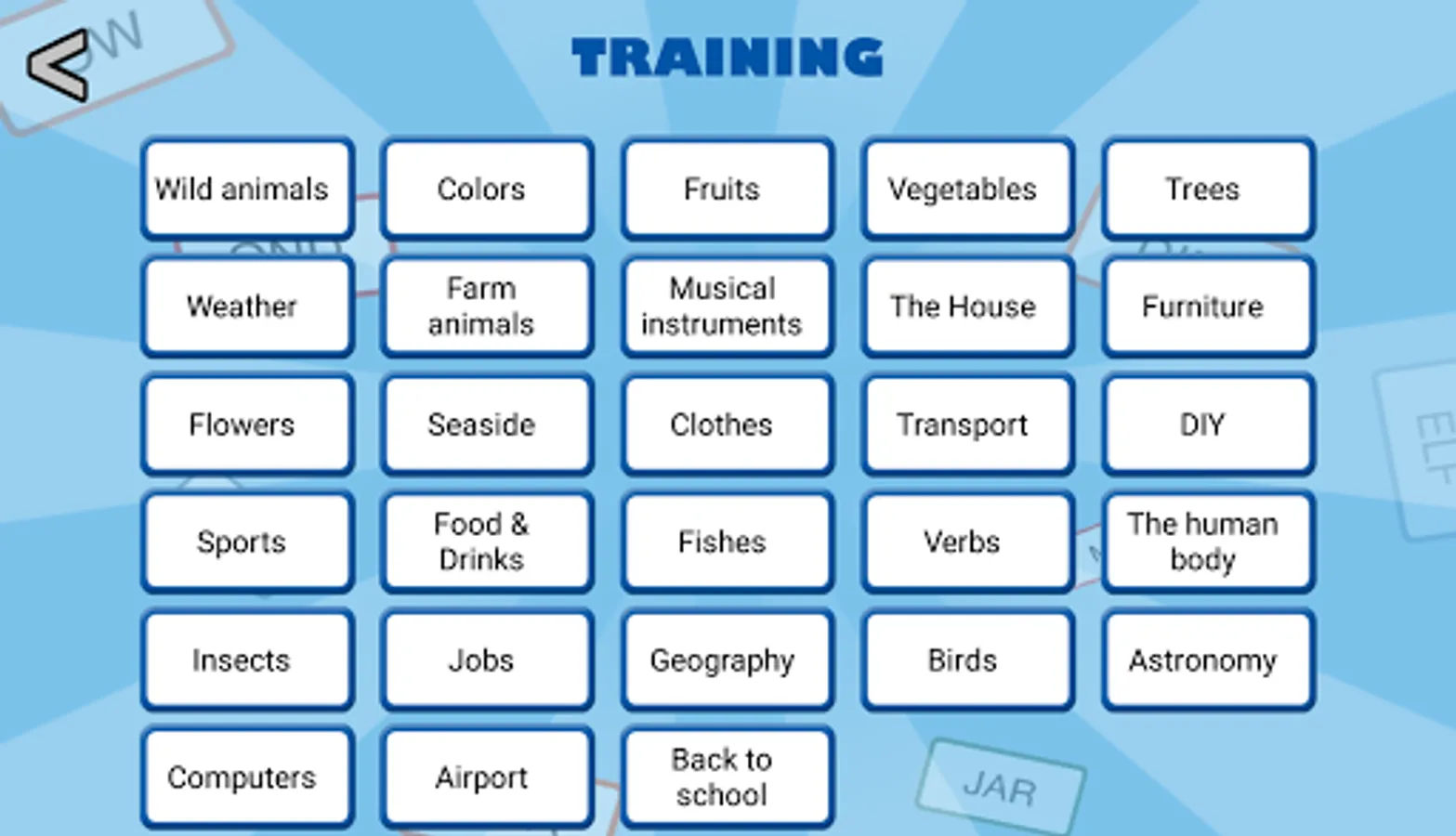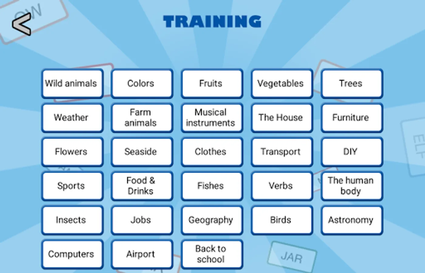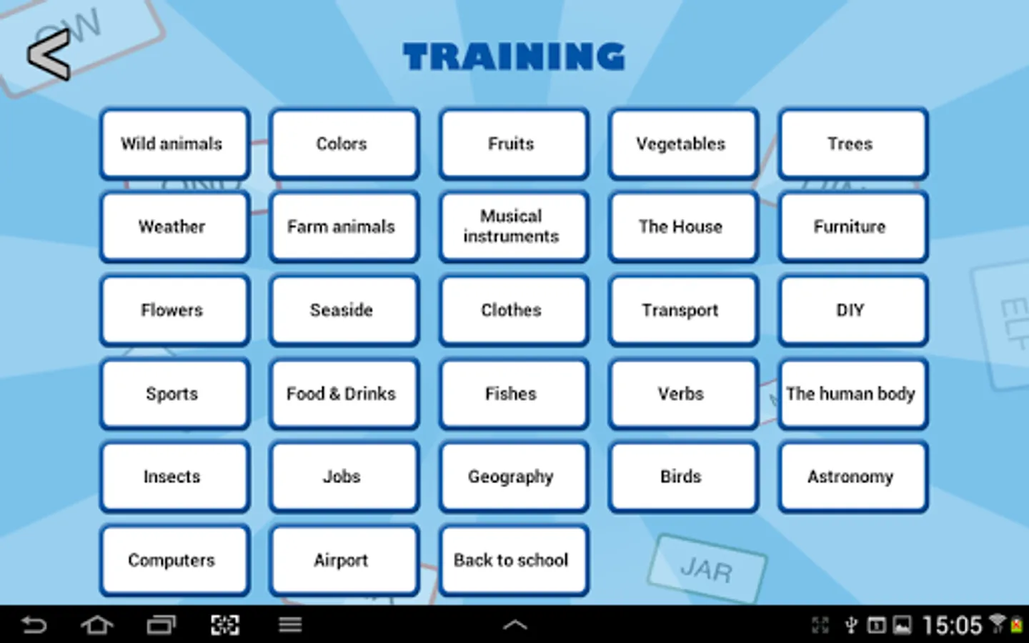 - more than 400 different words to find amongst 24 categories : animals, trees, fruits, vegetables, clothes, furniture, musical instruments...