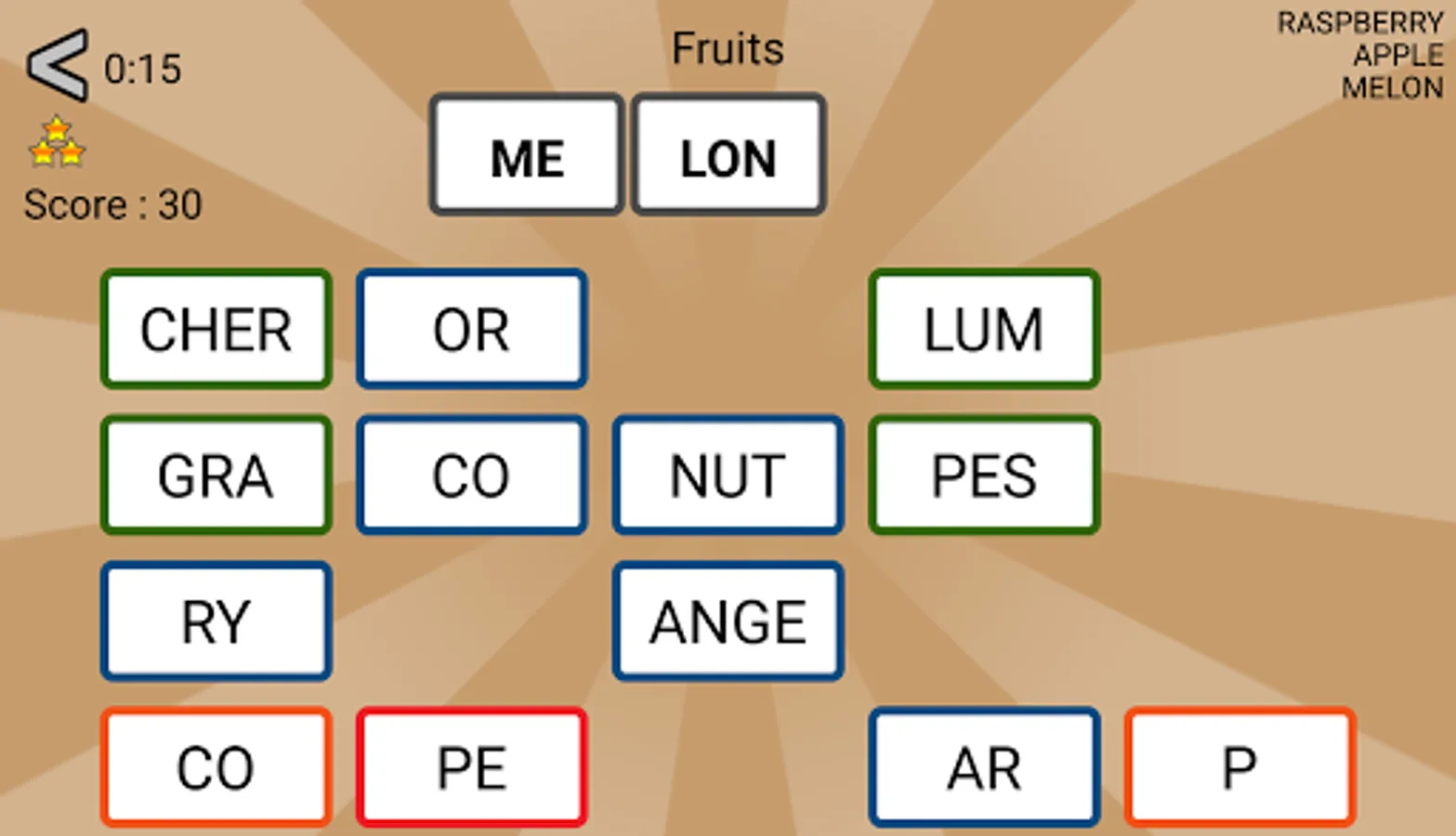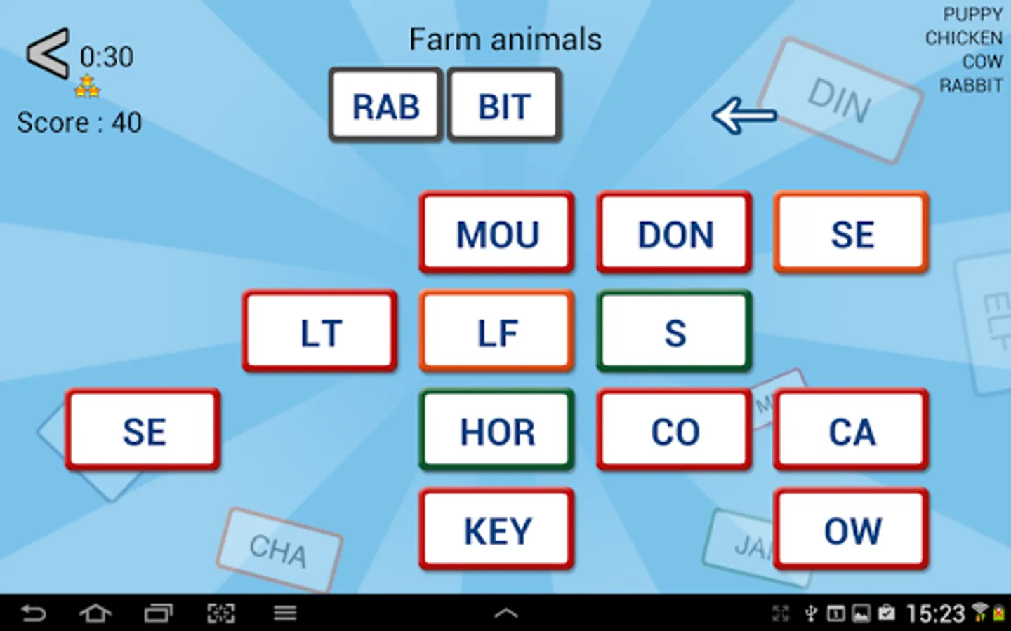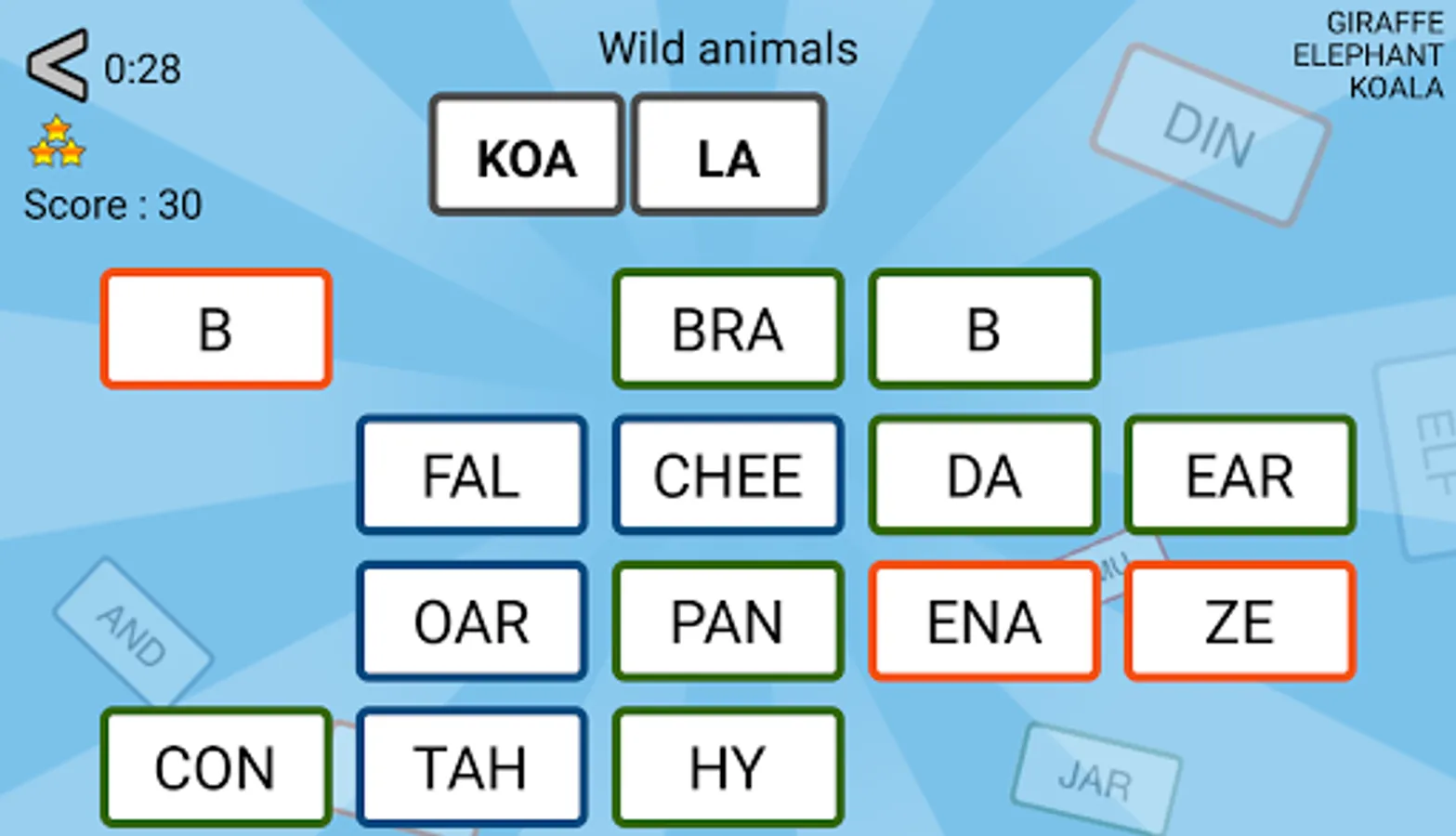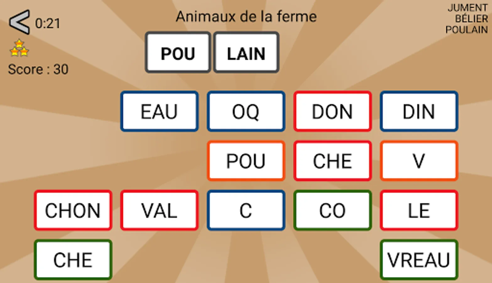 The goal of these word games : build words with the proposed syllables. In each game, words belong to a specific category.