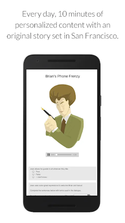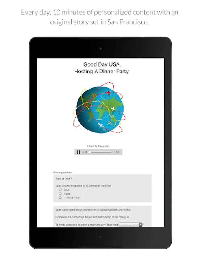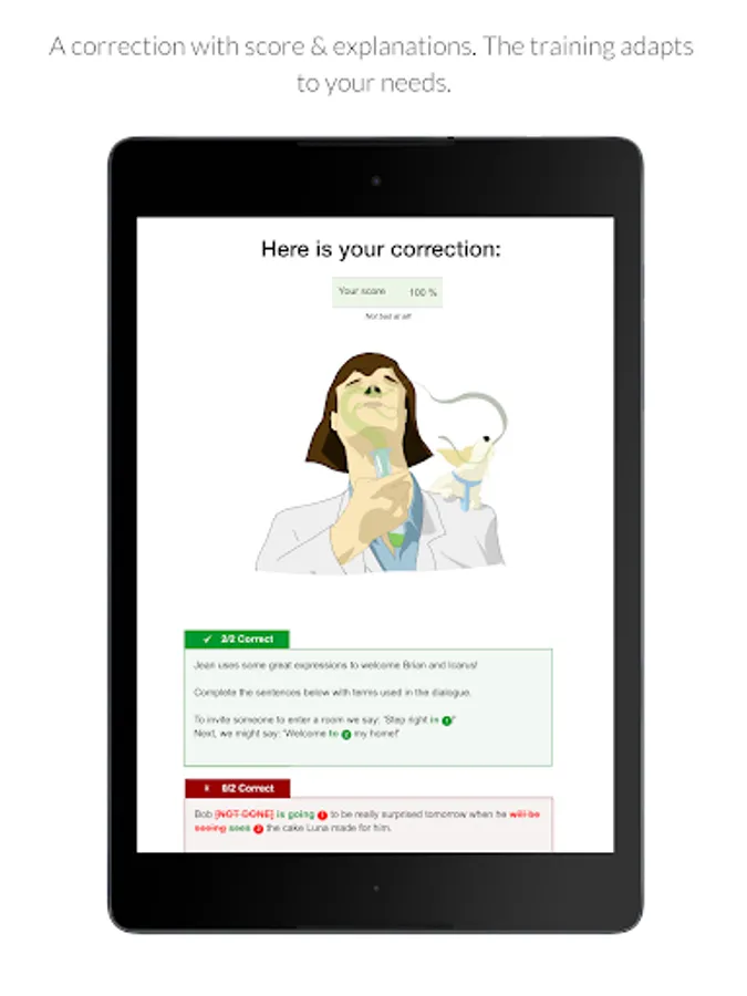 Each morning, you receive a lesson in English with a variety of written and audio exercises. Gymglish lessons take 10 minutes to complete, and include a story from the Delavigne Corporation, dialogues to listen to, questions to answer, 'mini-lessons', humour, business English, varied accents, and a personalised revision program. Once you have sent your answers, you will receive a correction with your score for the day's lesson, personalised explanations, the English vocabulary that interests you, scripts for the audio files, etc.