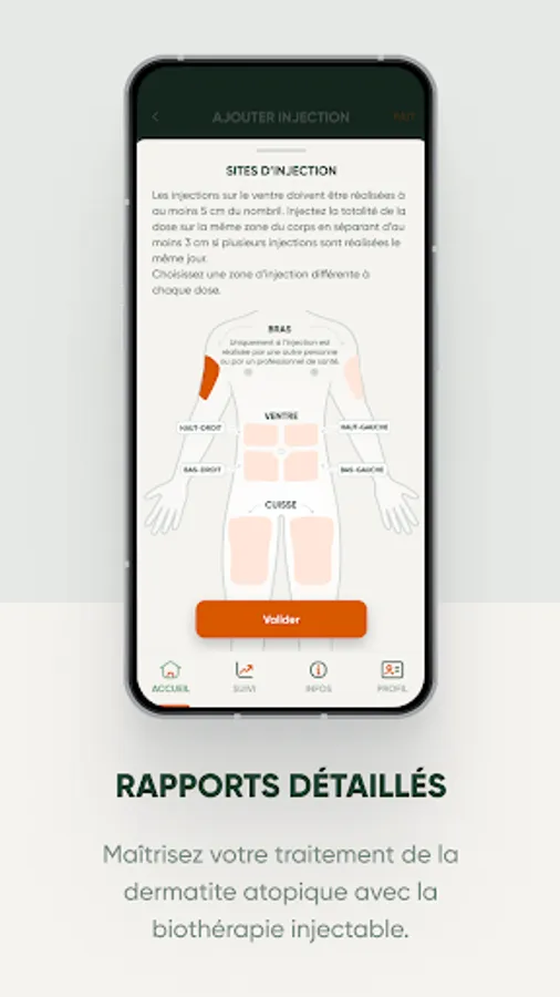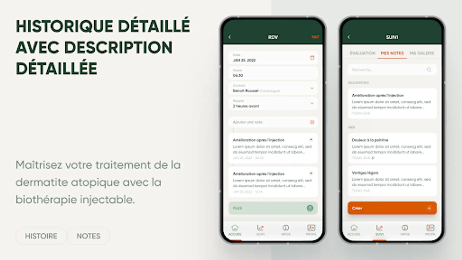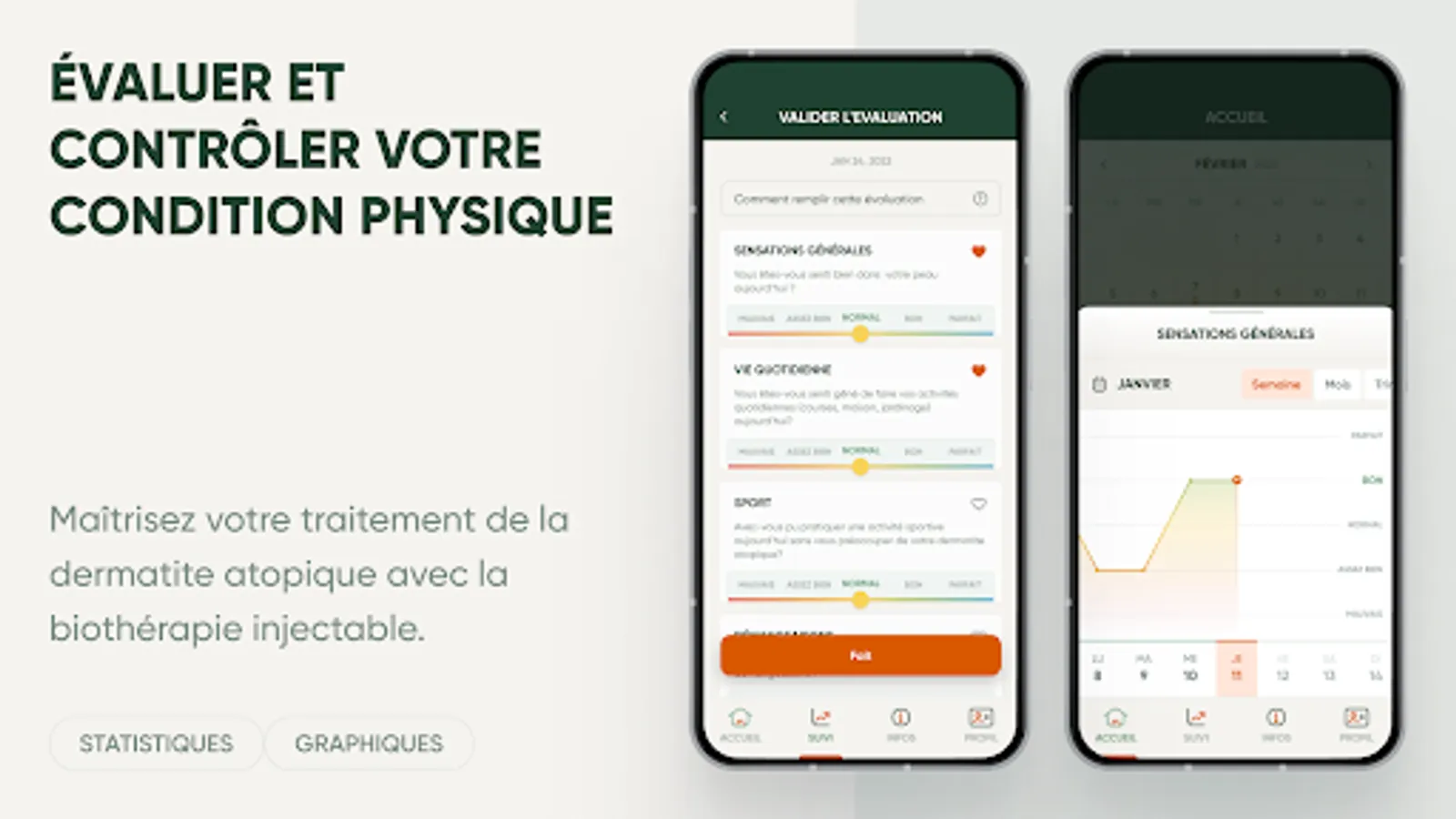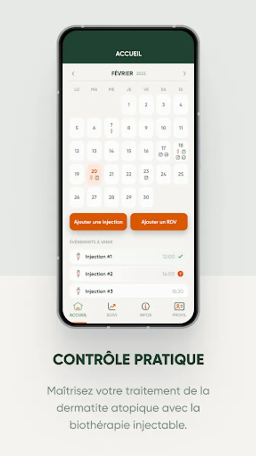DAppli provides daily support for your treatment with injectable biotherapy for your atopic dermatitis with injection assistance, advice and answers to the most frequently asked questions as well as useful daily tools: a diary to set your injection dates , your medical appointments and your notes, the possibility of taking photos and storing them in a gallery, the possibility of noting the evolution of your symptoms and/or your feelings thanks to monitoring curves.
