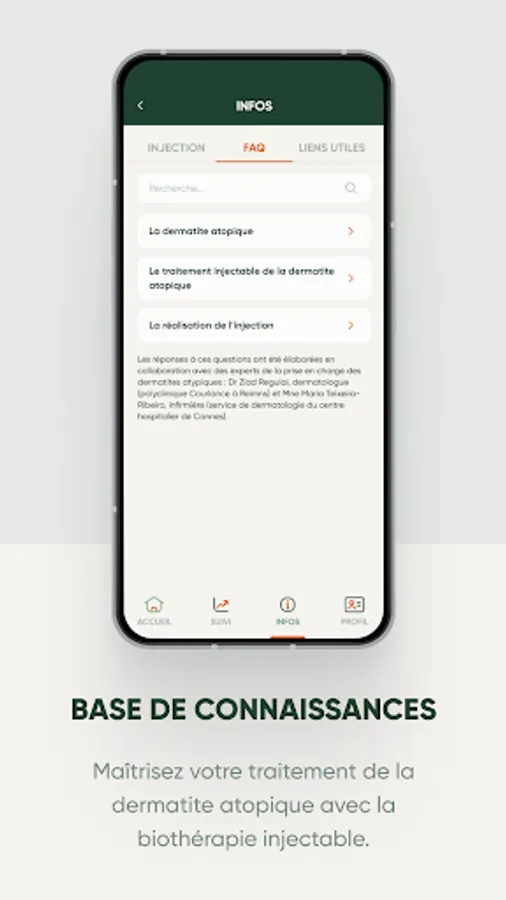 The application also provides information on the performance of subcutaneous injections made as part of biotherapy but also on atopic dermatitis and will allow you to find the most frequent answers to your questions. Also find testimonials from patients treated with injectable biotherapy for their atopic dermatitis.