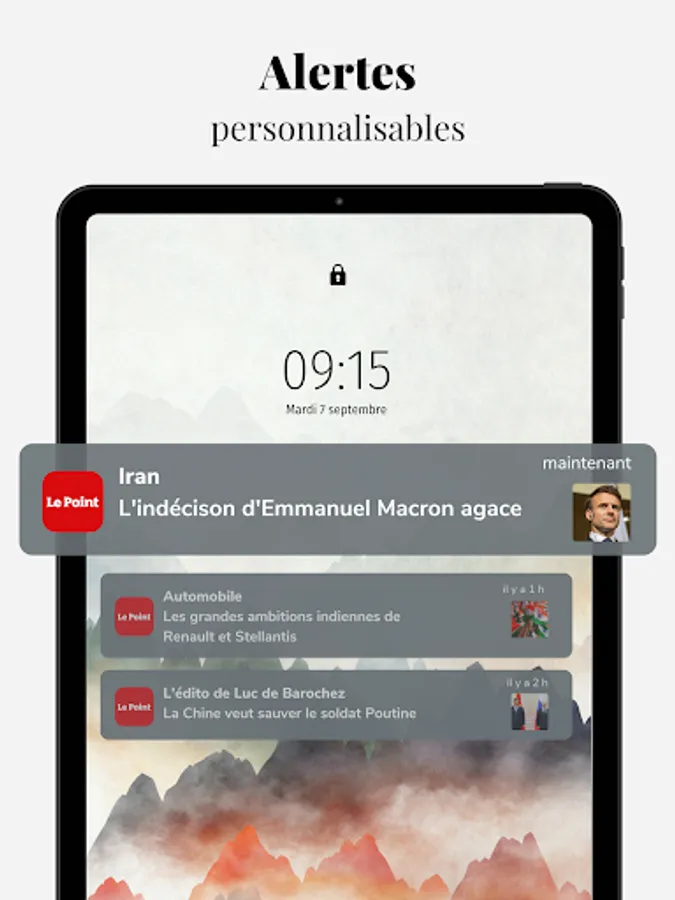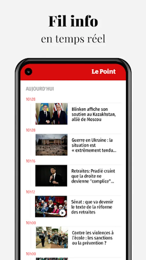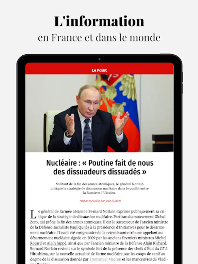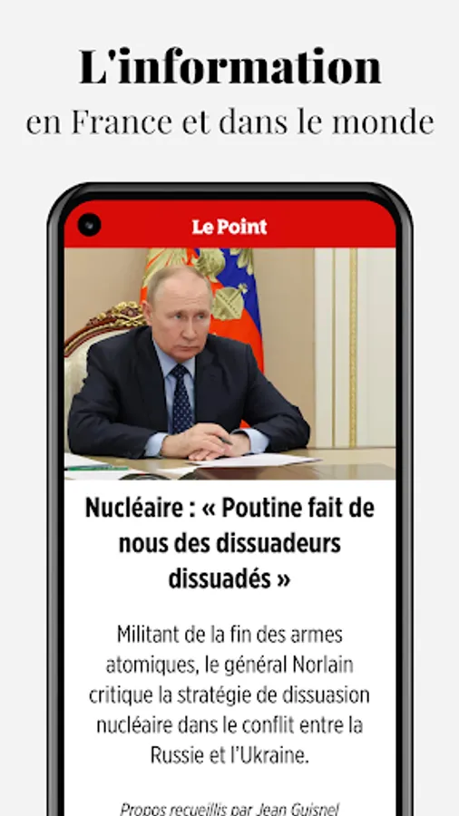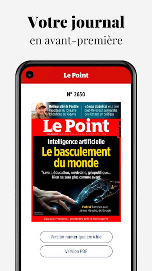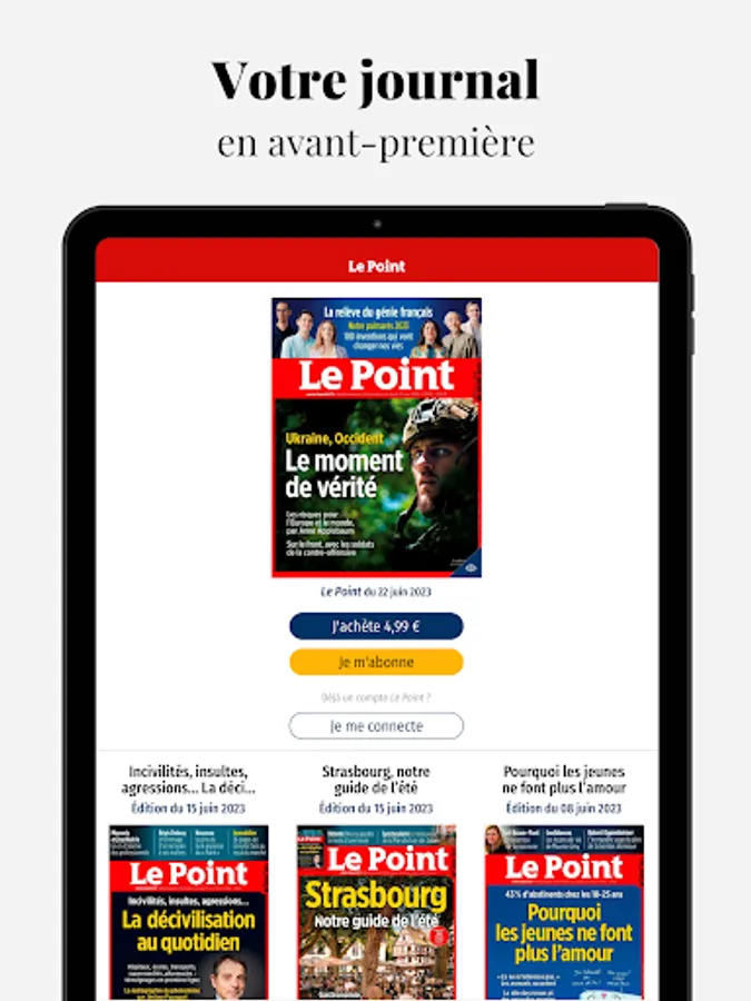 Download our application on your smartphone or tablet to follow all the news. Find all the richness, exclusivities and expertise of the newspaper Le Point at the service of live information.