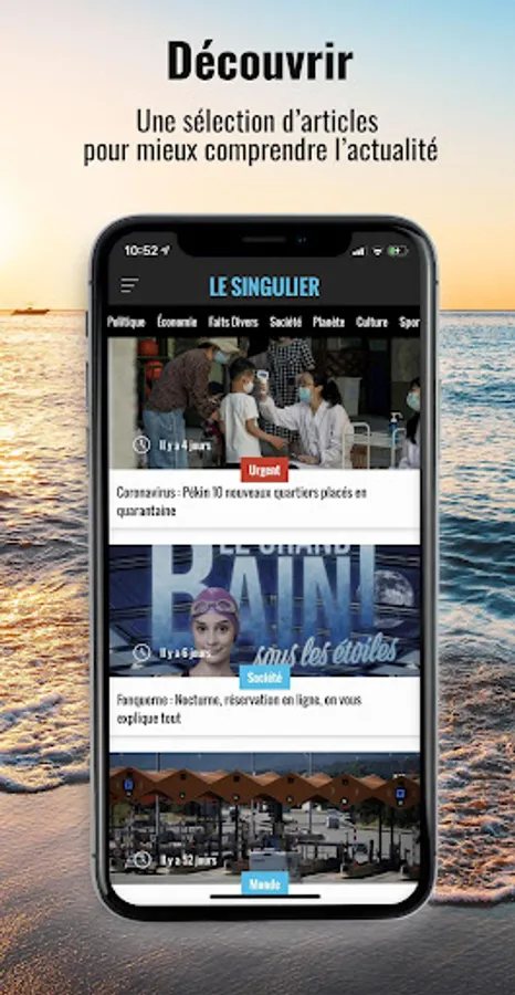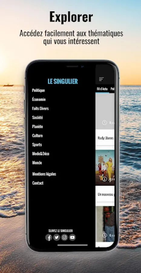 The Singular application invites you to discover a selection of articles to better understand local news. Politics, Economy, Various Facts, Society, Planet, Culture, Sports, Fashion & Decoration, World, you can easily access the themes that interest you.