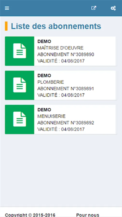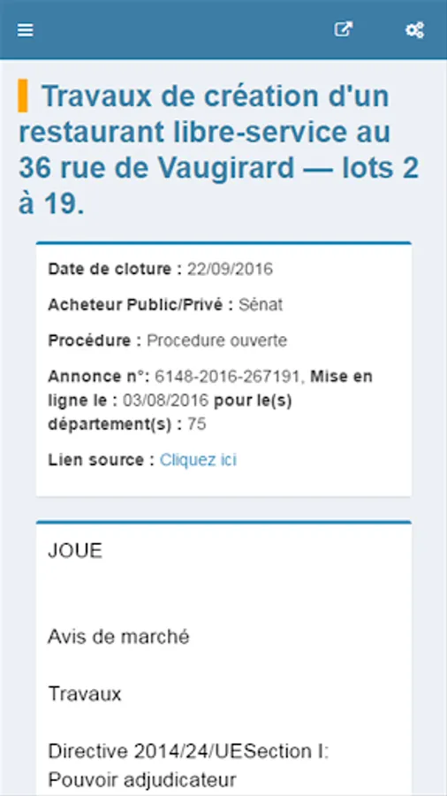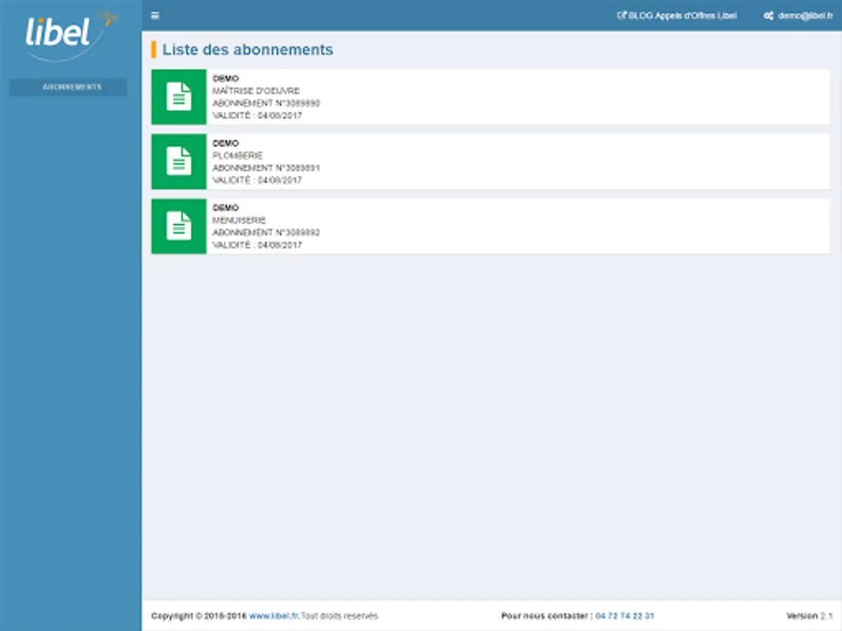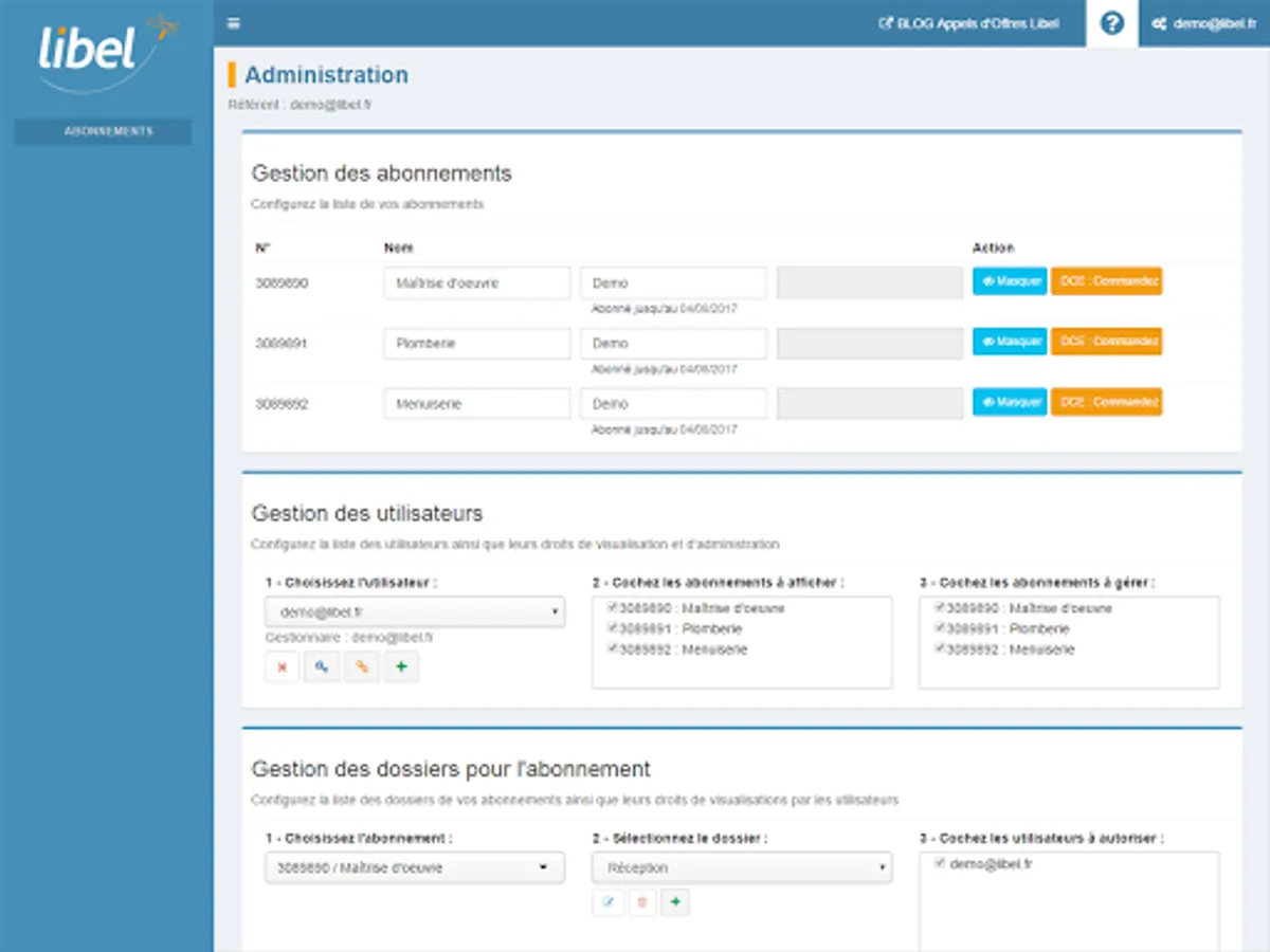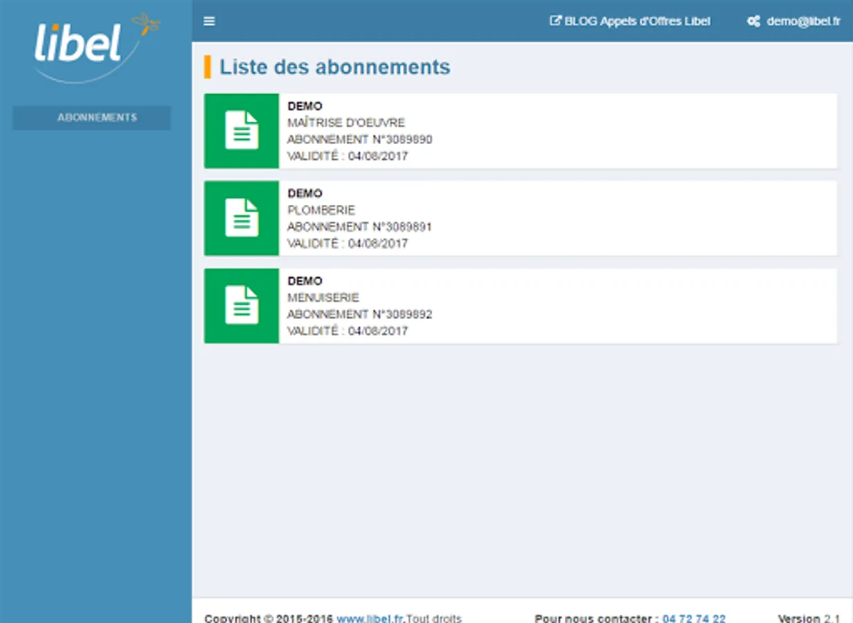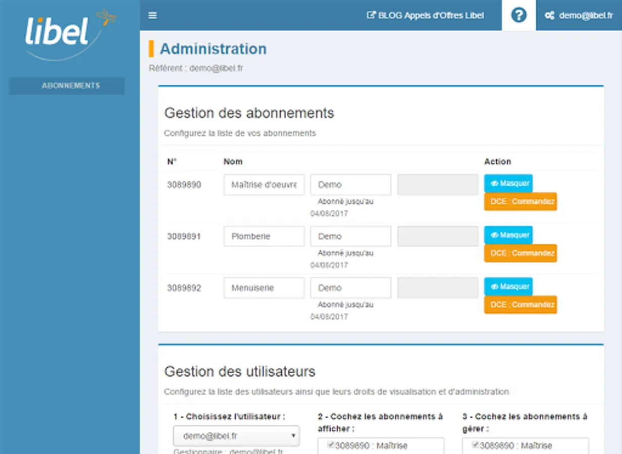 The application allows you to list and consult the calls for tenders for your personalized subscriptions as well as manage your account: name of your subscriptions, management of your users and your files.