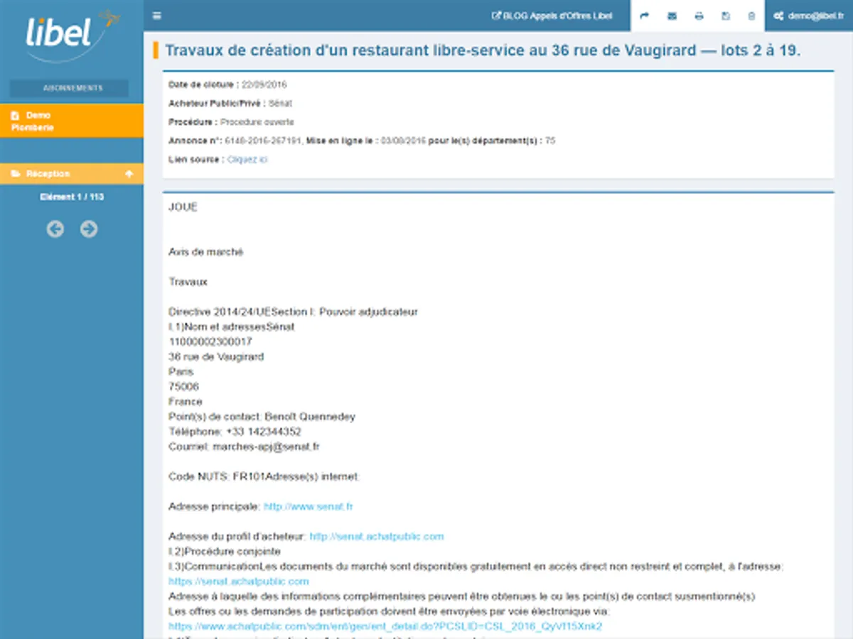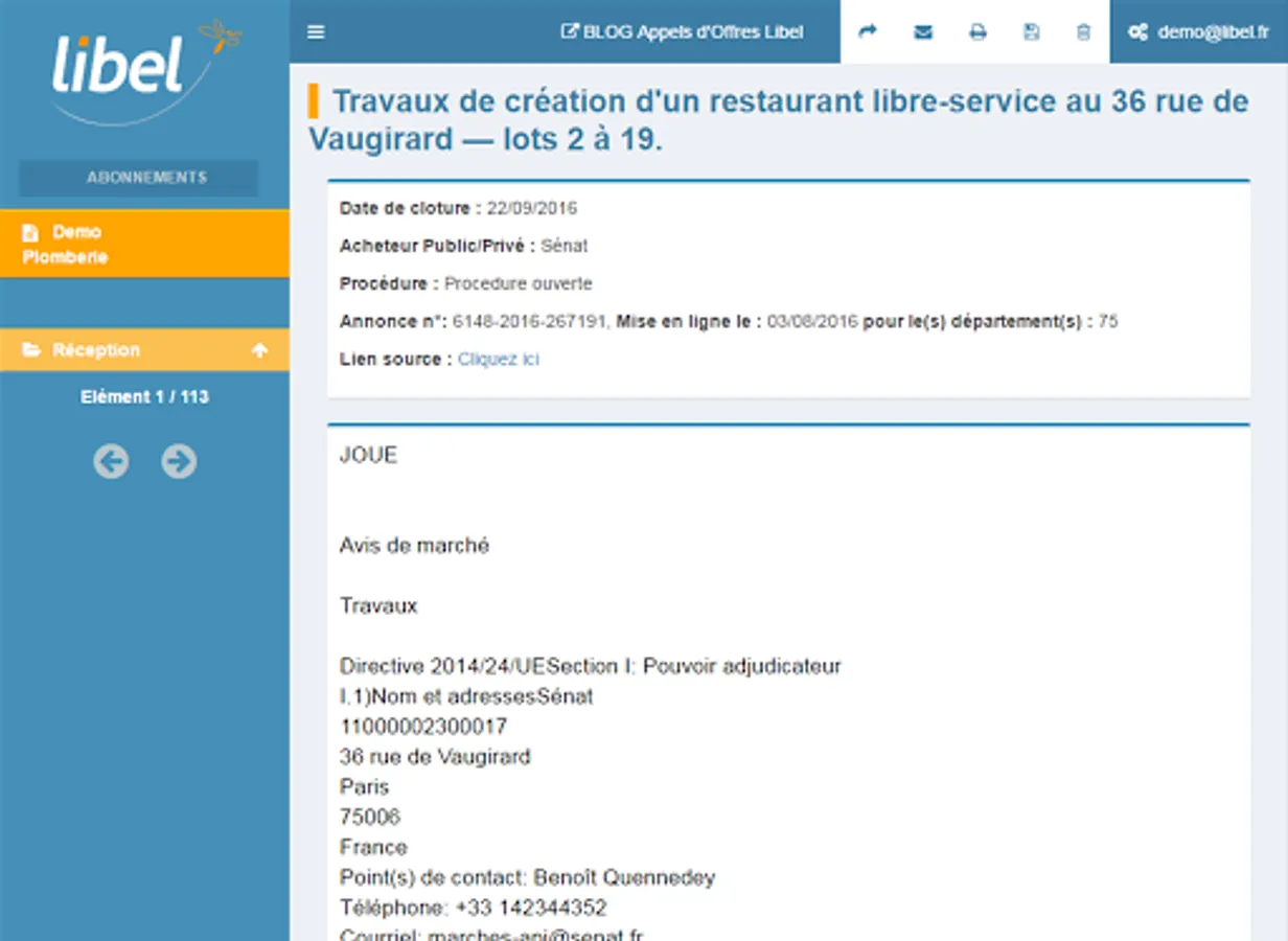 The “Libel Consultation of Calls for Tenders” application allows all professionals (architects, construction, services and supplies) to receive daily calls for tenders in the areas previously selected with our team.