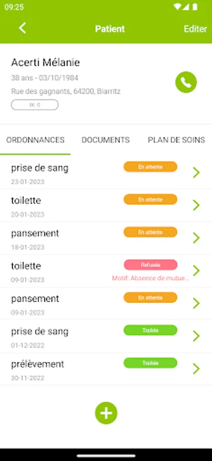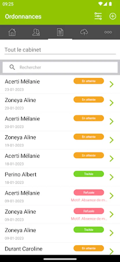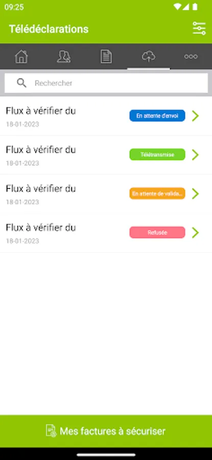 - view all your electronic declarations (flow to be checked) with the name of the patients and the amount invoiced, which you validate before sending, or refuse if you notice an error,