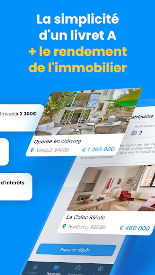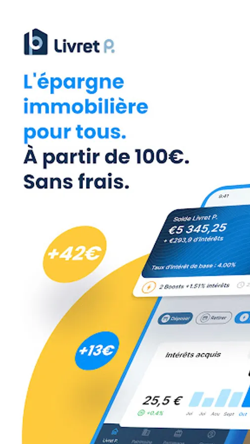 Livret P. is the mobile application, offered by Openstone, which democratizes real estate savings for all. This is the solution that allows you to invest your funds free of charge, from €100, against a return of 6% per year. The funds are reinvested in residential properties in dynamic French cities, one of the least risky asset classes. You can also boost your return by up to 6% per year by taking our weekly real estate and savings quizzes.
