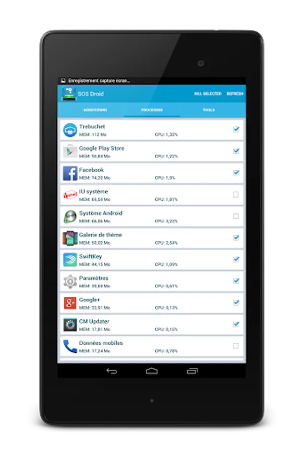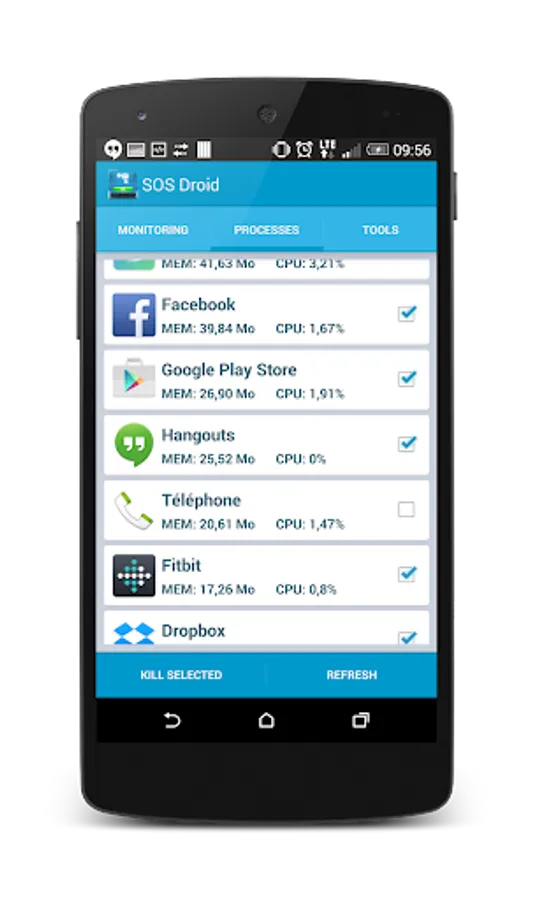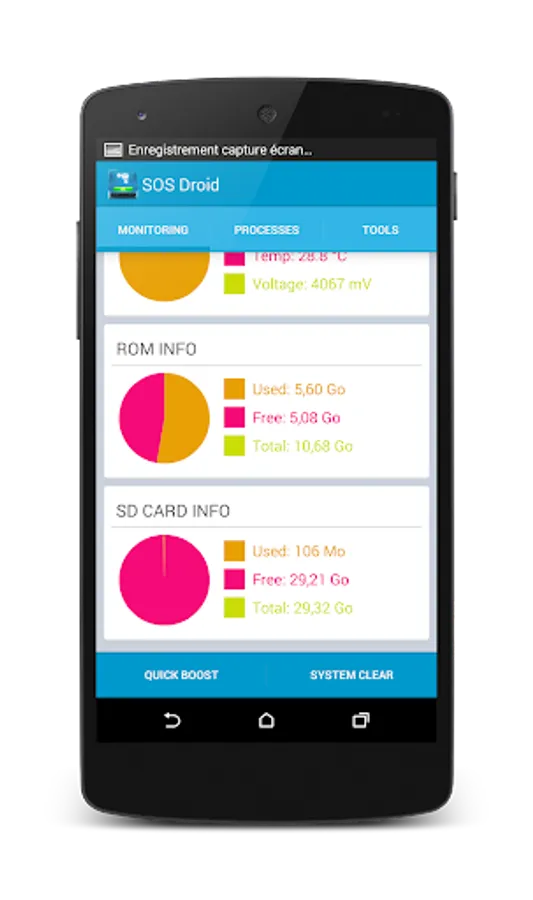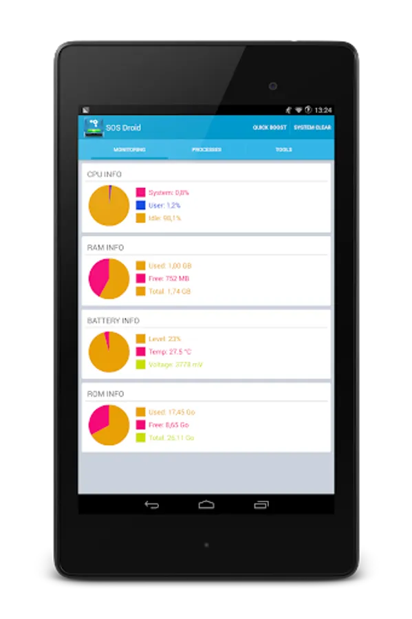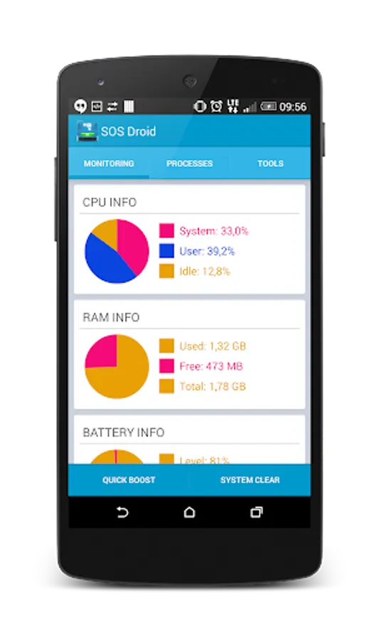 SOS Droid displays the status of CPU, memory, and battery in real time, allowing you to monitor system performance.
