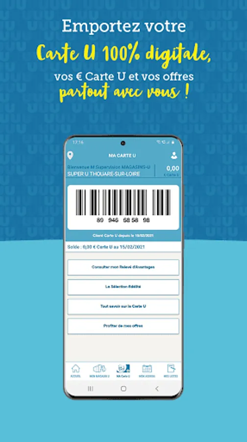 - Loyalty area: register your U CARD on your smartphone from a simple scan of your card, consult your benefits statement and as many services accessible at your fingertips, access the U Card offers for products in the Loyalty Selection of the month, easily find discounts and challenges to redeem on the purchase of products from major brands
