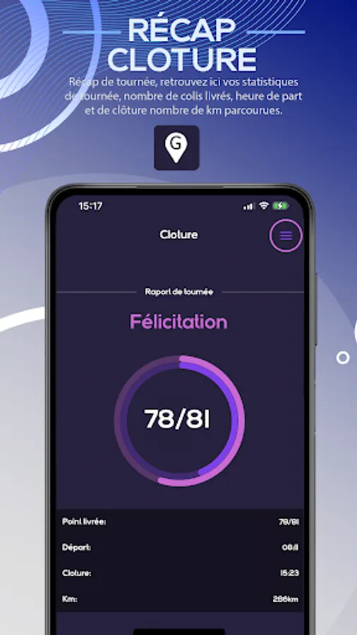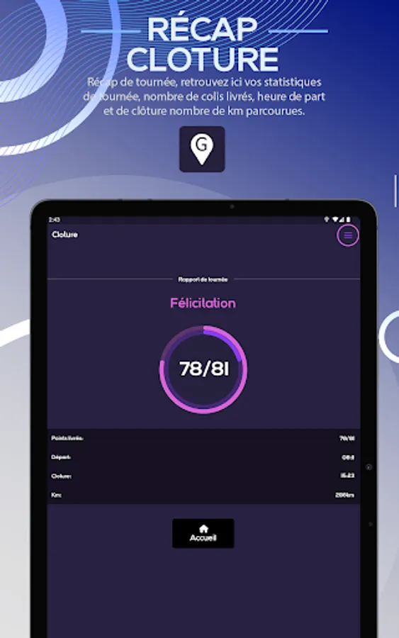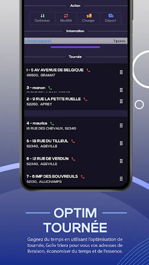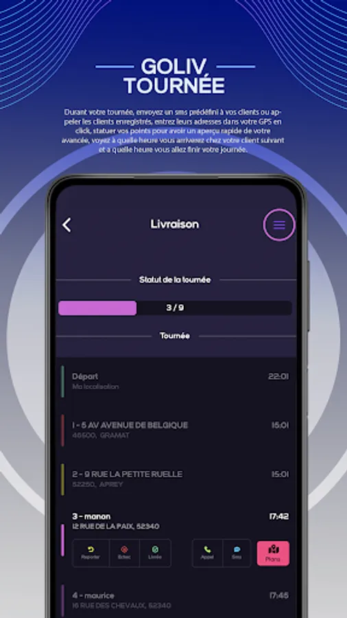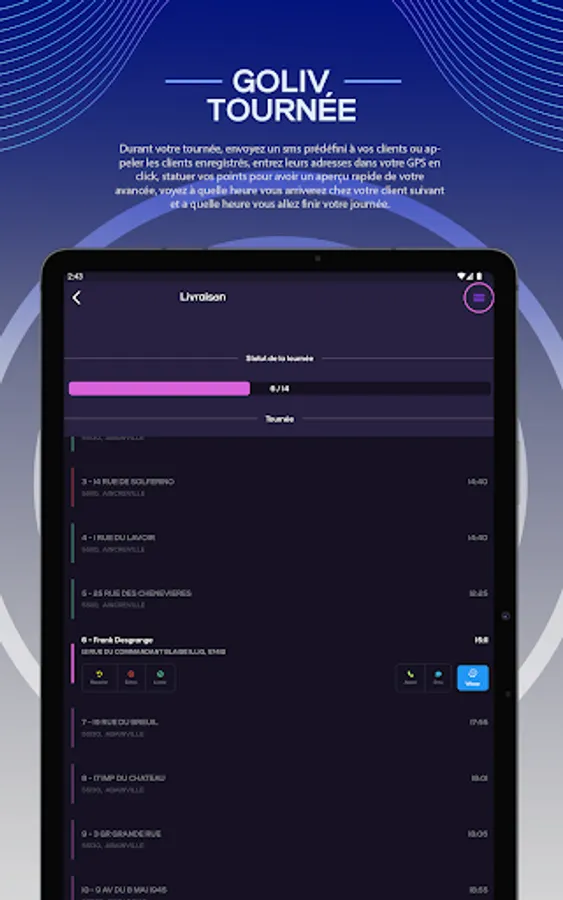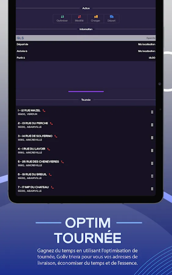A page containing all you have turned, with a button for quick access to your Gps defined in the settings, if the addresses belong to a client in your client book, you will then have a Sms button to send a predefined sms a you are a customer to warn them of your arrival, a Call button, and three buttons to decide the address correctly, namely Delivered, Reported or Failed, you will then be able to visualize where you are in your rounds and with the time updated with each validation of an address you will know the approximate time at which you will finish you have turned.