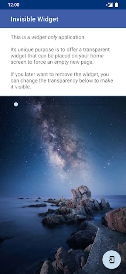 Its unique purpose is to offer a transparent widget that can be placed on your home screen to force an empty new page.