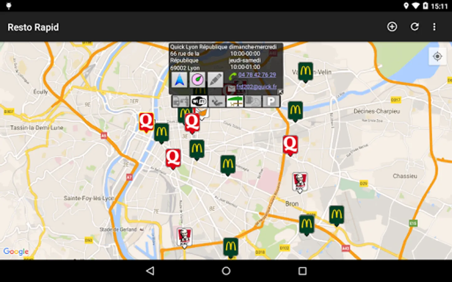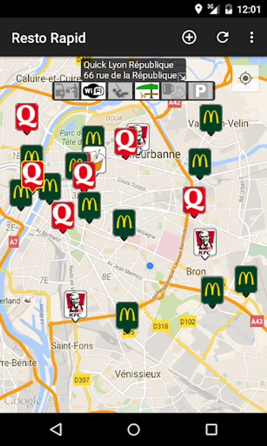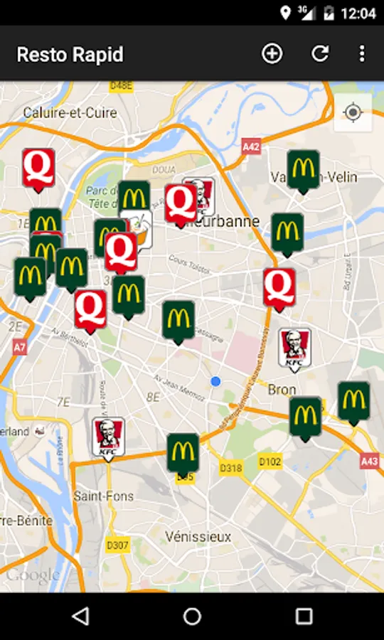 At launch, the map is automatically centered on your last known location and fast food restaurants around you are represented by signs.