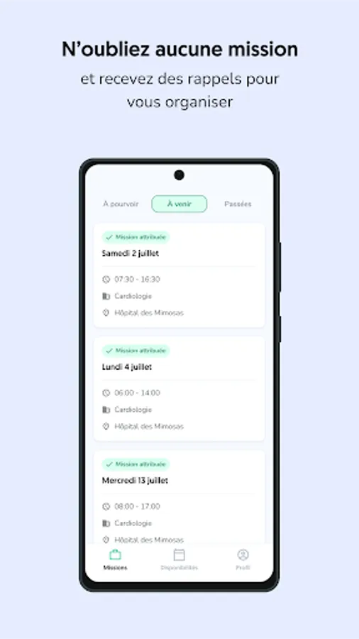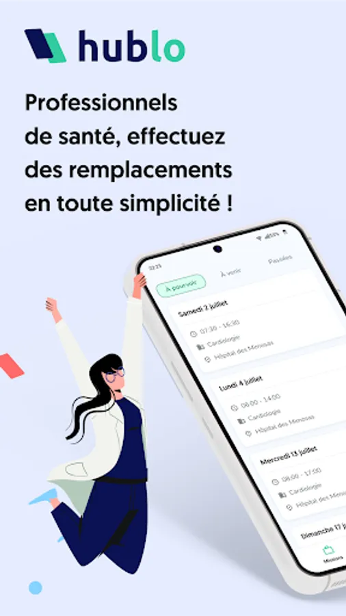 Healthcare executives, care directors... with Hublo, no more wasting precious time on the phone looking for available healthcare professionals. Thanks to our platform, simplify the management of replacements in your healthcare institutions and quickly call upon your network of trusted replacements.