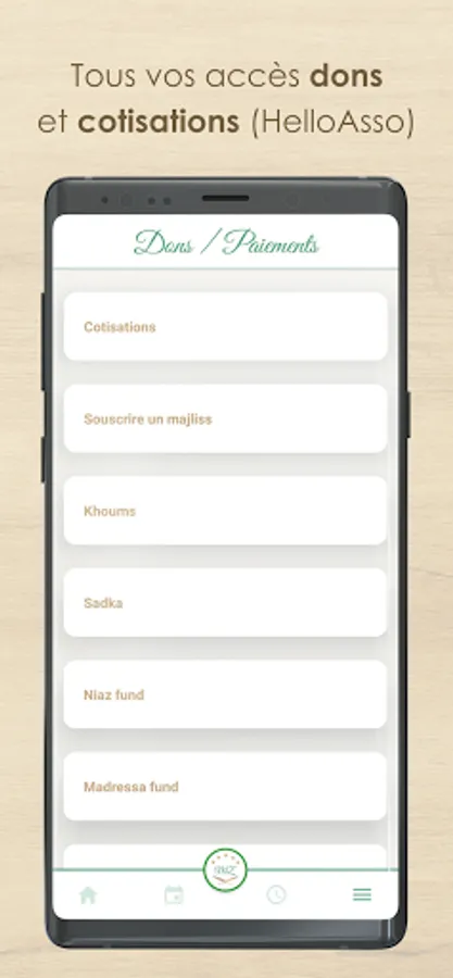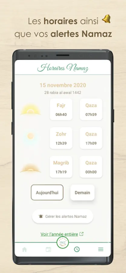 Namaz: The app gives you the Namaz (and Qaza) timetables directly. Subscribe to Namaz Alerts to be notified during Namaz hours with notifications.