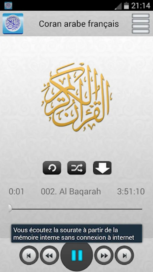 - You can download the surah directly on your device : you can listen to surah already downloaded using the same application without internet connexion
