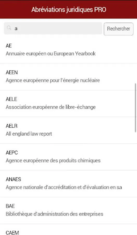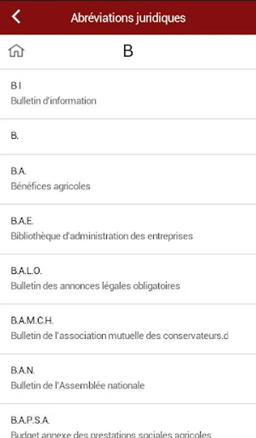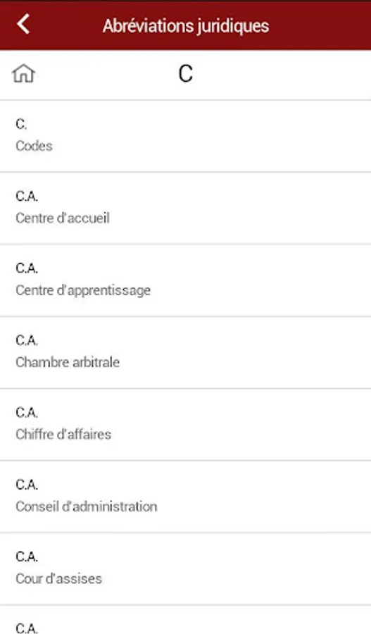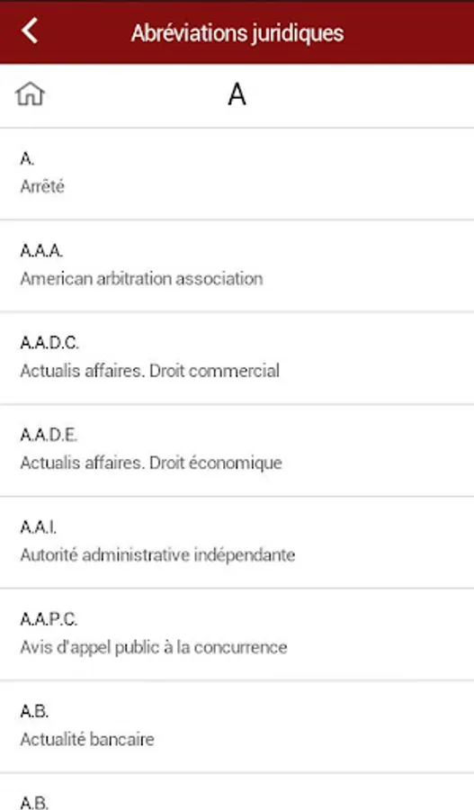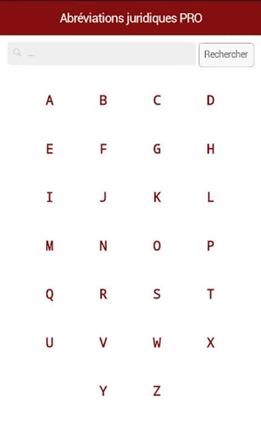 How it works ? Discover the list of abbreviations in alphabetical order. On the Home screen, click one of the letters to access the list of legal terms and their definitions.