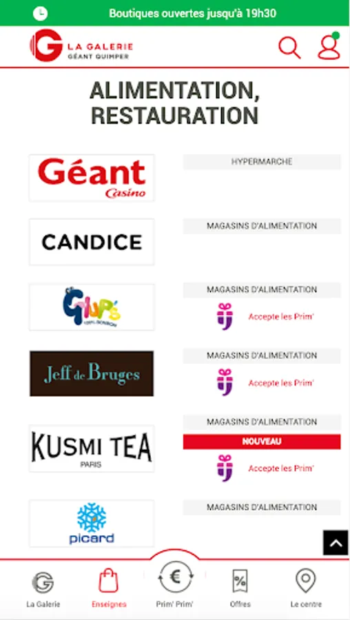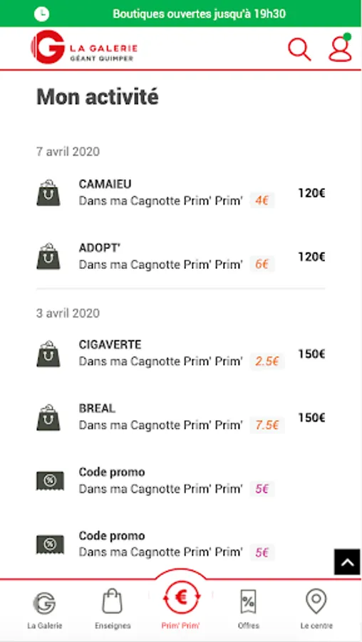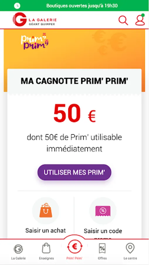 You present your app at the checkout of La Galerie stores, you accumulate euros with each purchase and these euros turn into Prim ’to spend in La Galerie stores, with no minimum purchase! 2%, 5%, 7%, 10% .... get rewarded all year round for your purchases, depending on the operations in progress.