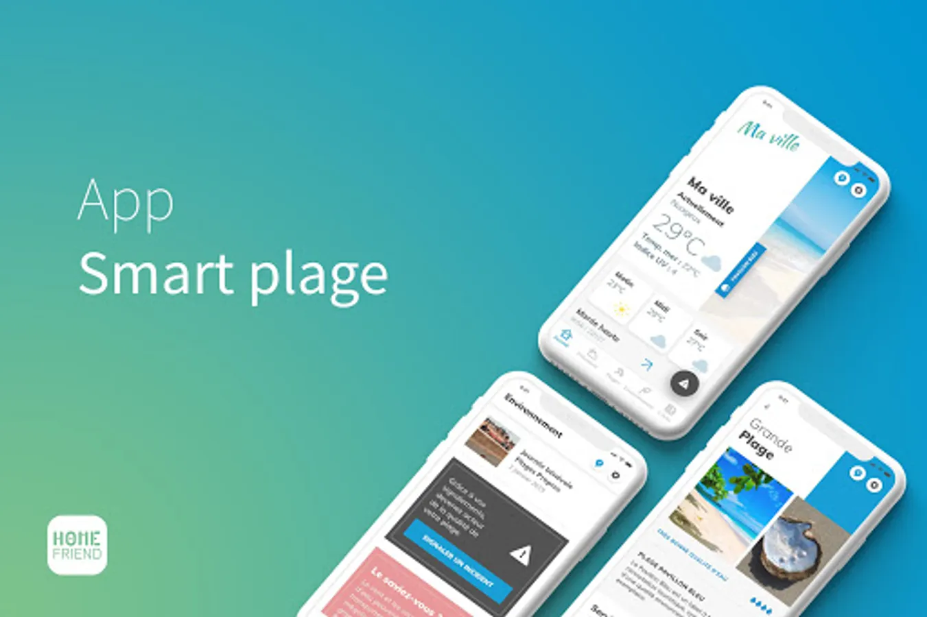 To meet the desire of coastal cities to communicate in an innovative way with residents and holidaymakers increasingly connected and to enhance the attractiveness of territories, HomeFriend company has designed a mobile application, the "Smart Beach" app.