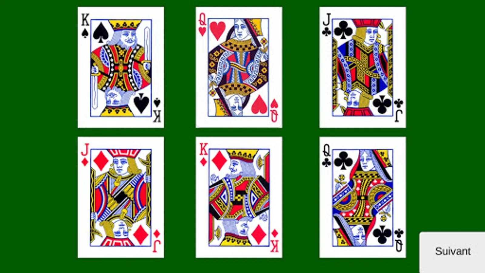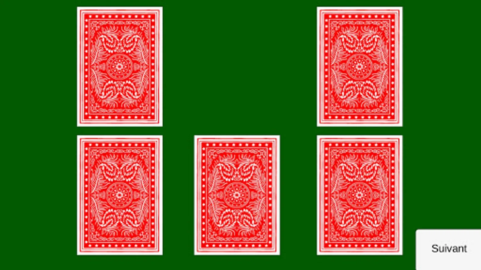 Six cards are shown, the viewer chooses one. The cards are shuffled and the chosen card will eventually disappear like magic!
