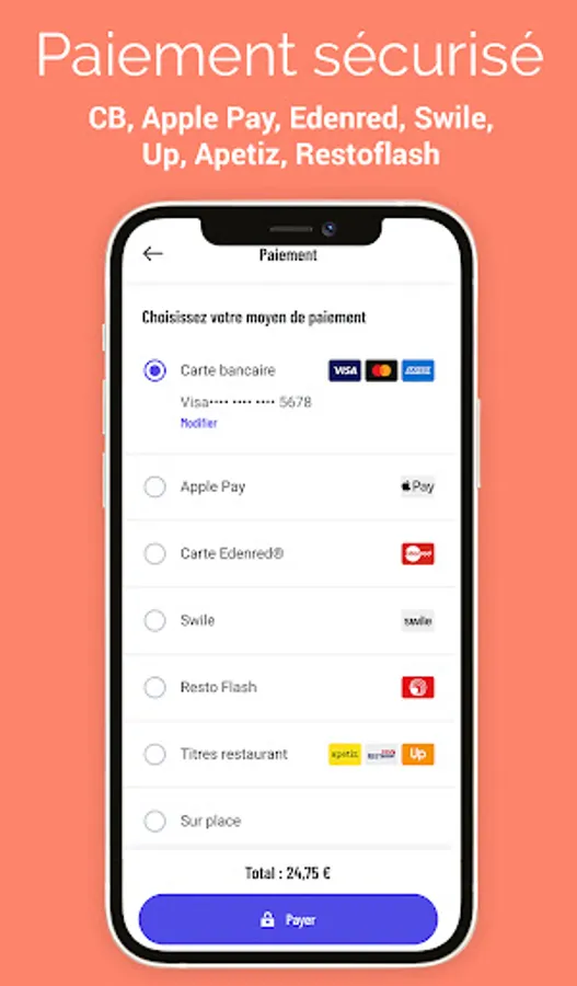 5. Pay online by credit card, by Ticket-Restaurant Edenred, Swile, Apetiz, Upjeune, Restoflash, PassRestaurant card, by Google Pay, or on site at the time of collection by click and collect.