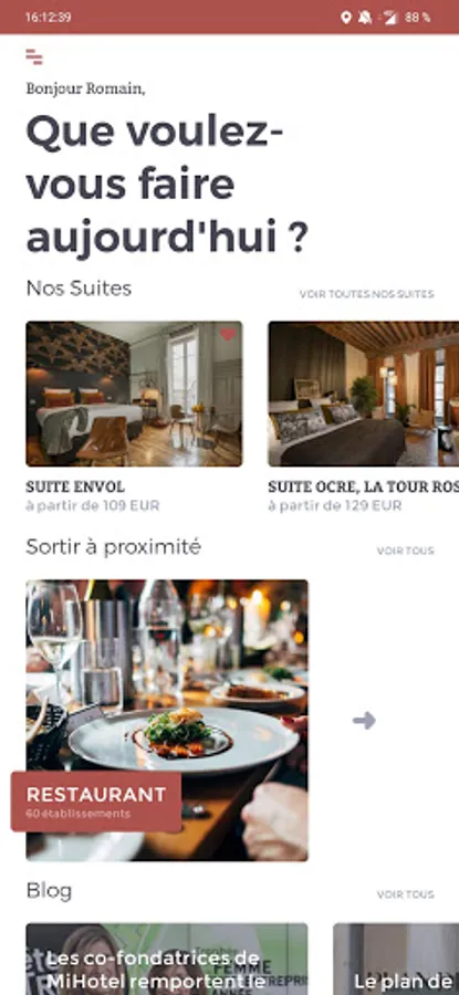 Example: Arrival in your Suite at 19h, 22 degrees, the connected fireplace is lit, a plate of tapas waiting for you cool, two breakfasts are delivered for the next morning at 7:30 and that your Yoga class starts at 9am in your Suite!