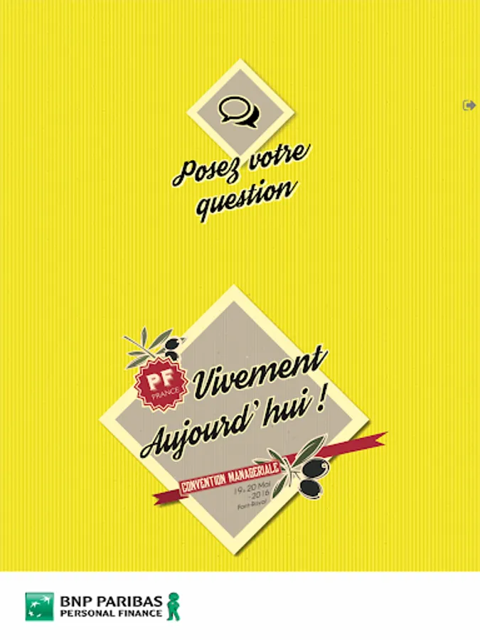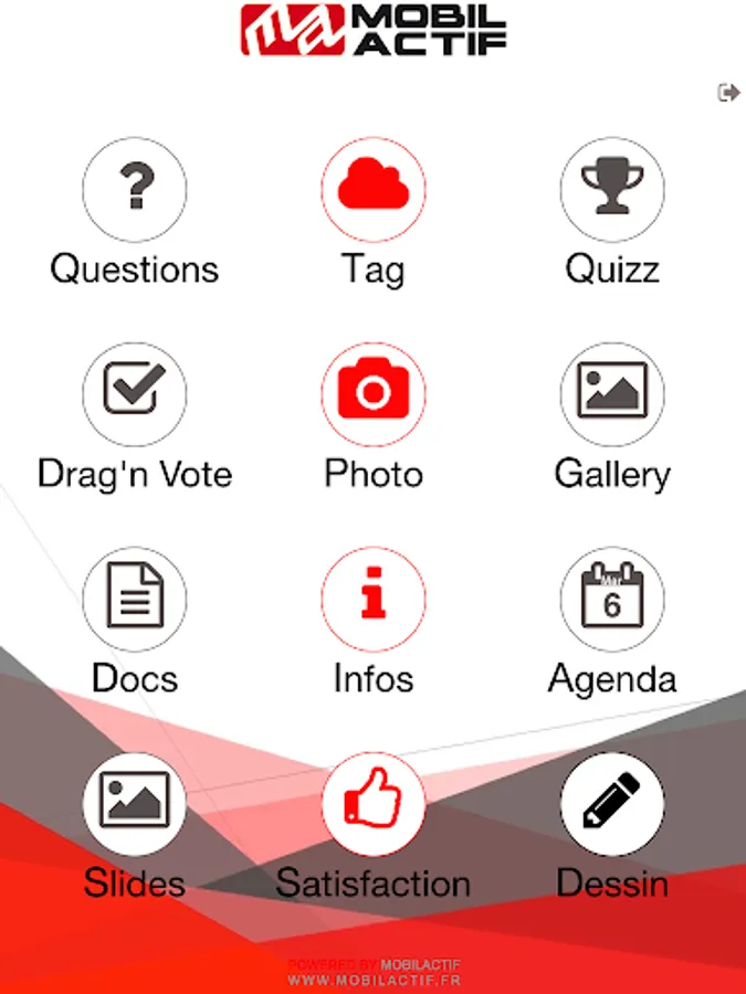 Hyper-customizable application to become active at an event: Quiz, Q & A, word cloud, collaborative workshop, live slide monitoring, satisfaction survey, taking notes, tifo, photo animation, logolive ... We advise and develop all the interactive modules you need. The personalization is total!