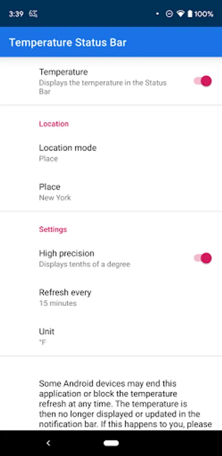 Displays the weather temperature directly in the Status Bar + Notification.