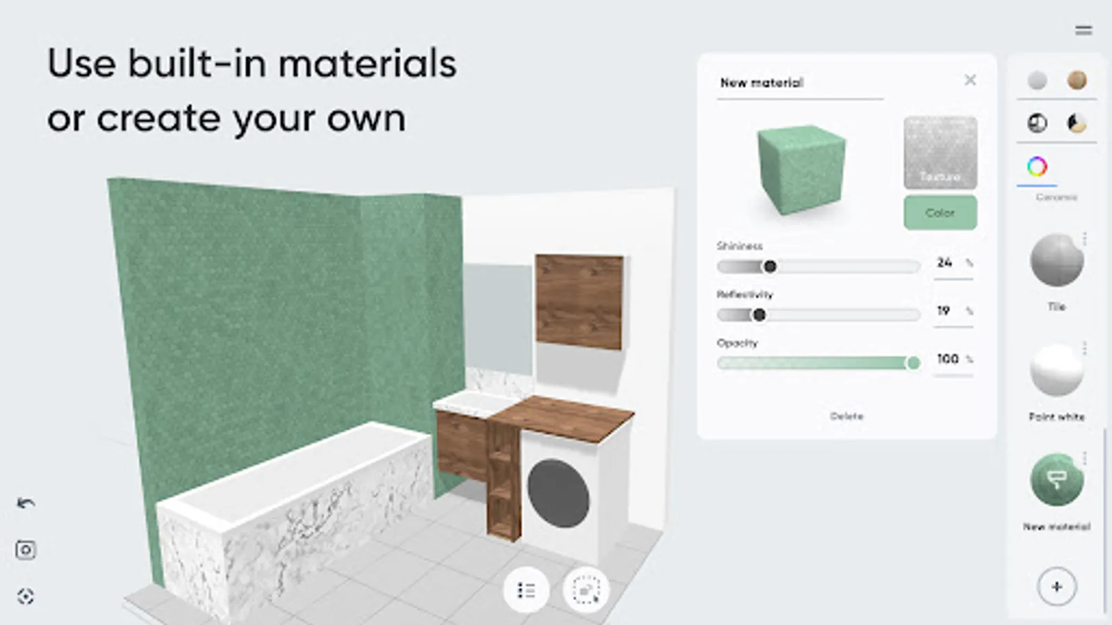 Choose which material to apply to your 3D furniture from our library (paint, wood, metal, glass). Or create your own material with a simple editor.